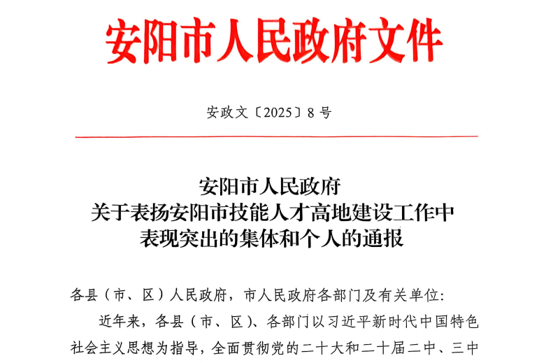 近日,安阳市人民政府印发《关于表扬安阳市技能人才高地建设工作中变现突出的集体和个人的通报》,Beat365因在安阳市技能人才高地建设工作中变现突出获得通报表扬。