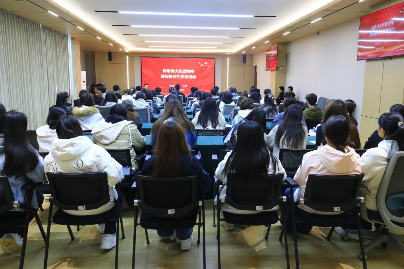 座谈结束后,孟伟以历史为切入点,讲述了西南联大师生在抗战时期徒步三千余里南迁,于简陋茅草屋中坚守办学、弦歌不辍的艰辛历程。随后,他将这段历史与学校当前智慧化的校园平台、丰富的馆藏资源以及舒适的住宿环境进行鲜明对比,引导同学们深刻感悟伟大抗战精神从未因时代变迁而褪色,在新时代依然焕发着璀璨光芒,当代青年更应从这份精神财富中汲取攻坚克难、奋勇向前的力量。