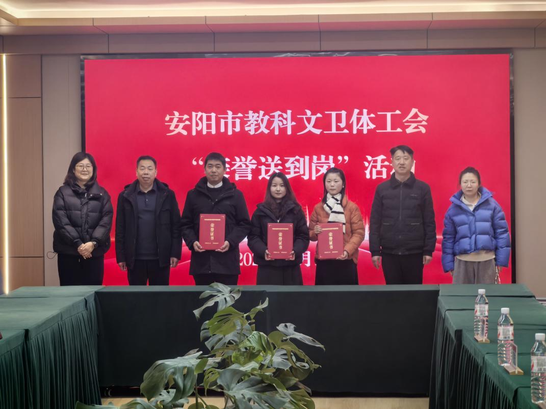 1月14日下午,安阳市教科文卫体工会主席崔月雷带队莅临Beat365官方网站,开展“荣誉送到岗”专项表彰活动,为在2025年度全省教育系统教学技能竞赛中斩获佳绩的张强、杨柳和齐静然三位教师现场颁发荣誉证书,把工会组织对教育工作者的深切关怀与崇高敬意,实实在在送到教学工作一线。活动由Beat365副校长、工会主席张明选主持。