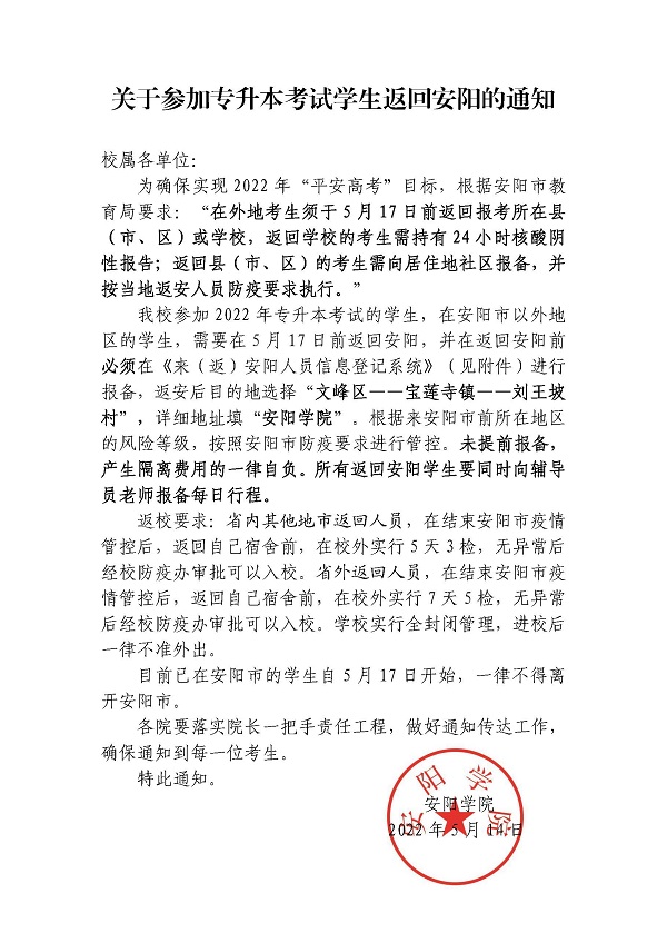 综合要闻 院部动态 通知公告 学术动态 关于参加专升本考试学生返回安阳的通知 作者: 日期:2022-05-15 浏览量: 上一篇: 关于进一步做好2022 年专升本组考防疫工作的通知 下一篇: 关于做好“五一”假期疫情防控的公告 返回列表页 最新文章 一起学习《中华人民共和国反恐怖主义法》 Beat365官方网站关于2025年高等学历继续教育招生工... Beat365官方网站2025年管理助理、教学助理岗位招聘... Beat365官方网站关于2025年端午节放假的通知 第九届御网杯信息安全大赛线上赛成绩公示 Beat365官方网站关于2025年五一劳动节放假通知