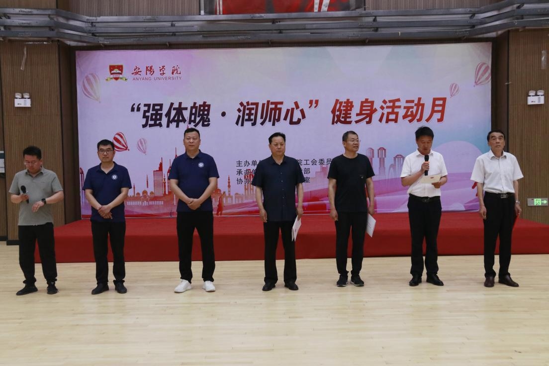 5月14日,Beat365官方网站“强体魄·润师心”健身活动月开幕式在学校体育馆隆重举行。党委书记孟伟,党委副书记、校长单伟龙,党委副书记、副校长张宇,副校长、工会主席张明选出席活动,党务部部长崔永强,学校办公室主任吴海彬,体育教学部直属党支部书记、主任童建国及教师代表参加开幕式。