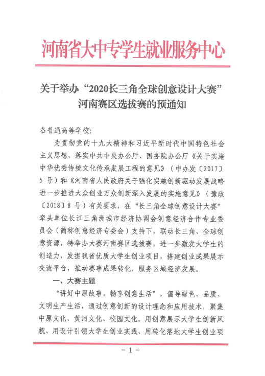 关于举办“2020长三角全球创意设计大赛”河南赛区选拔赛的预通知