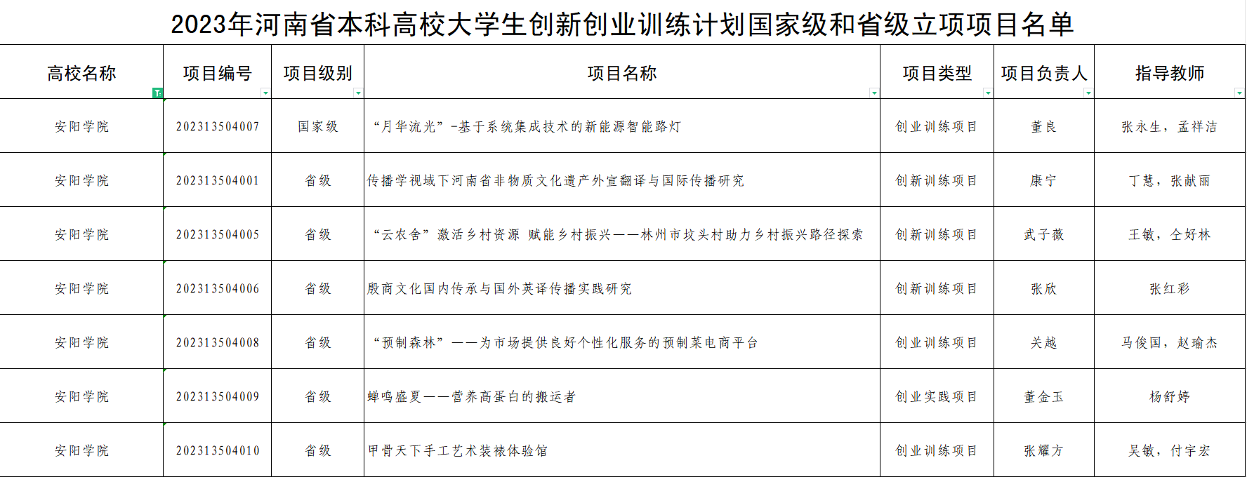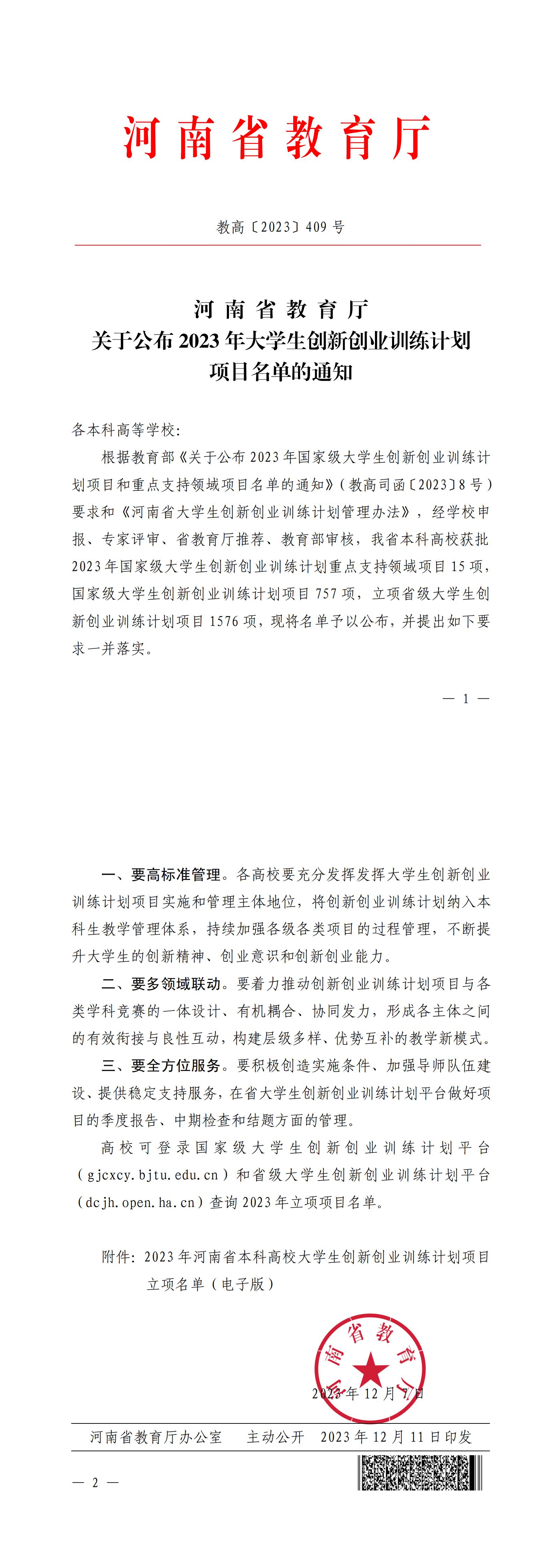 河南省教育厅关于公布2023年大学生创新创业训练计划项目名单的通知