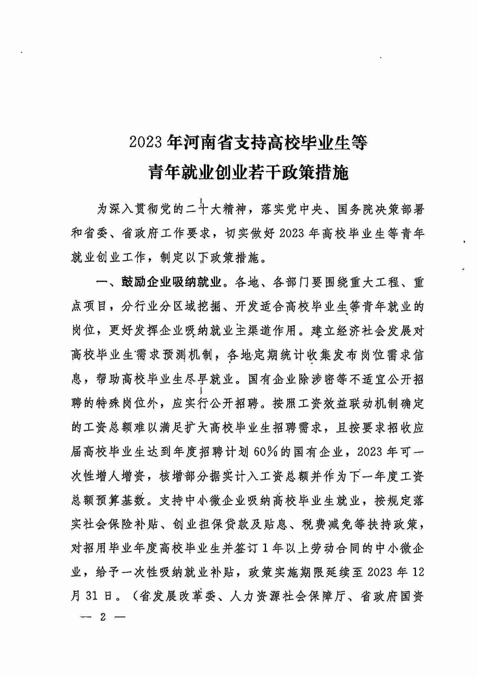 河南省人民政府办公厅关于印发2023年河南省支持高校毕业生等青年就业创业若干政策措施的通知