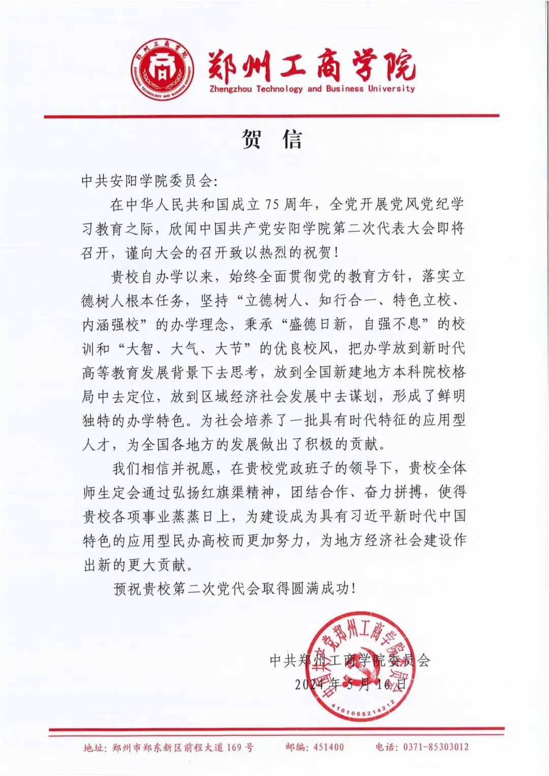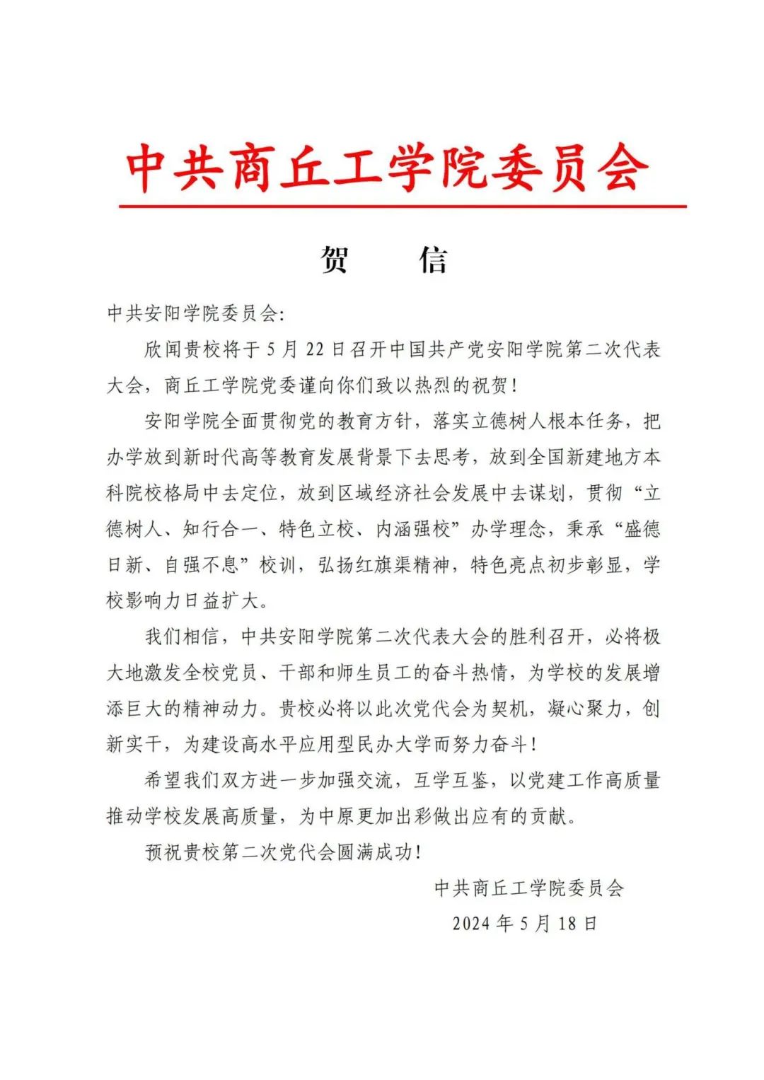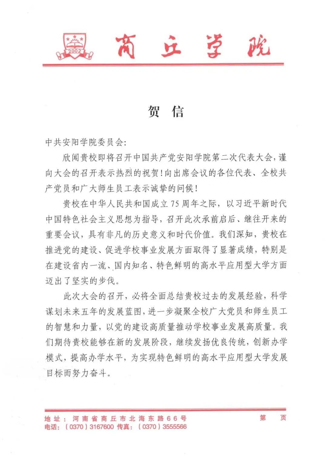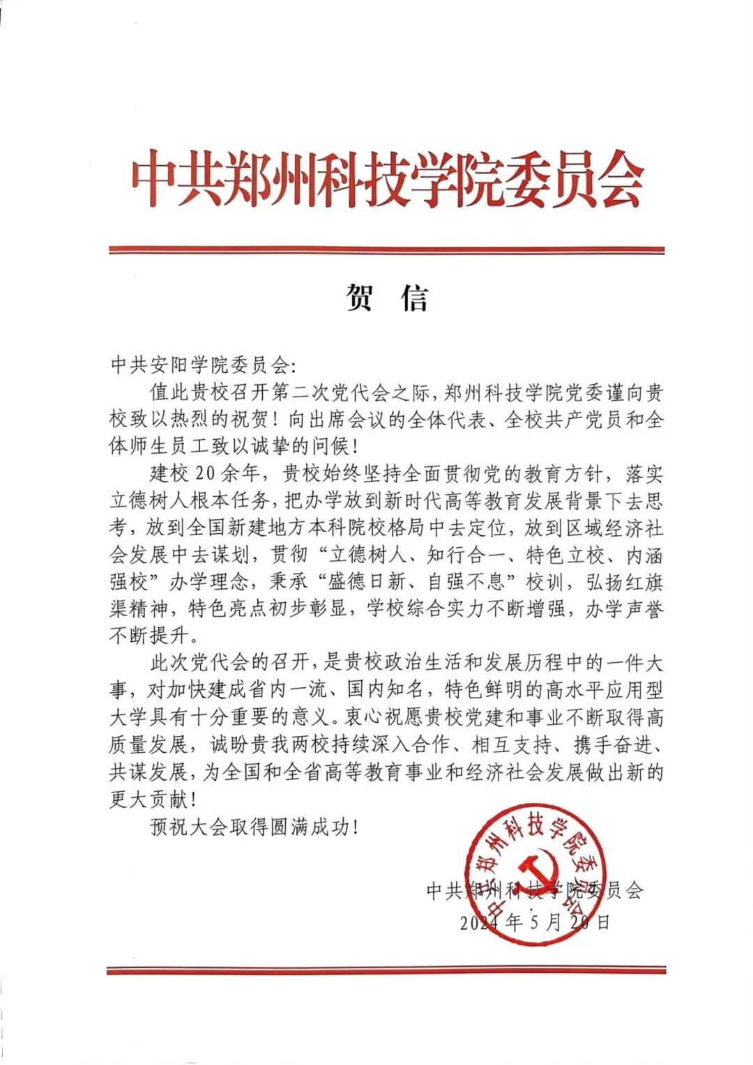 各高校在贺信中指出,本次大会是在喜迎新中国成立75周年,全党开展党纪学习教育之际,召开的一次非常重要的大会,具有承前启后、继往开来的意义。本次大会的胜利召开,必将进一步凝聚共识,激发伟力,不断推进学校事业高质量发展再上新台阶、再谱新篇章。全校师生定将在新一届党委领导班子的带领下,踔厉奋发、锐意进取,为加快建设省内一流、国内知名,特色鲜明的高水平应用型大学而努力奋斗!