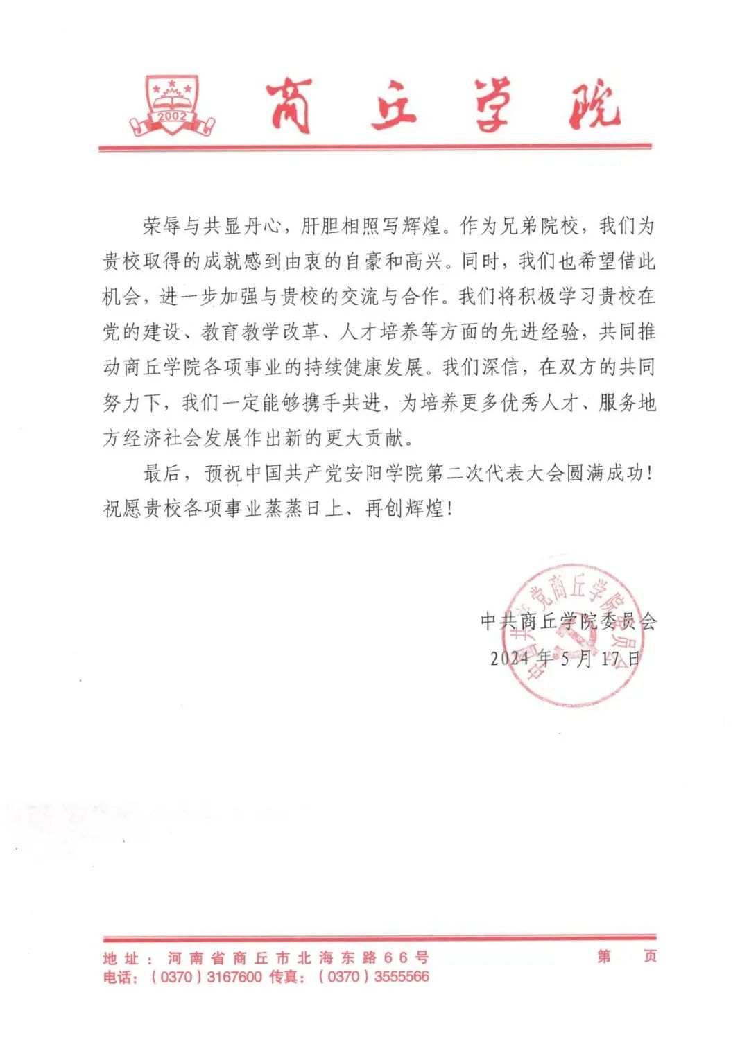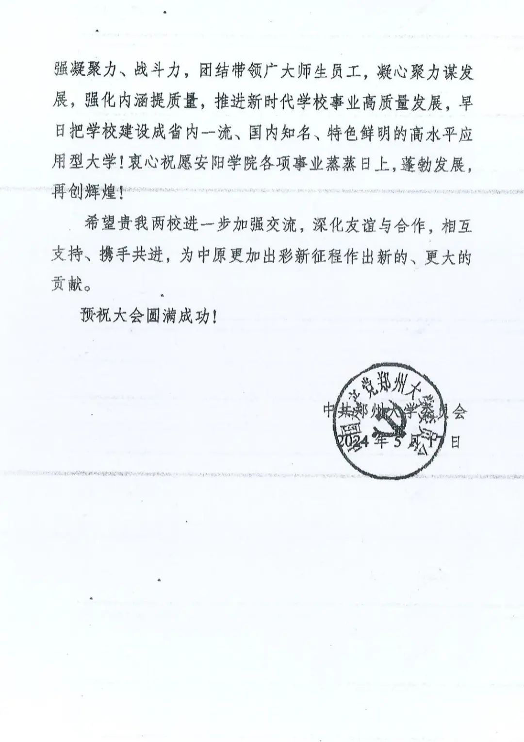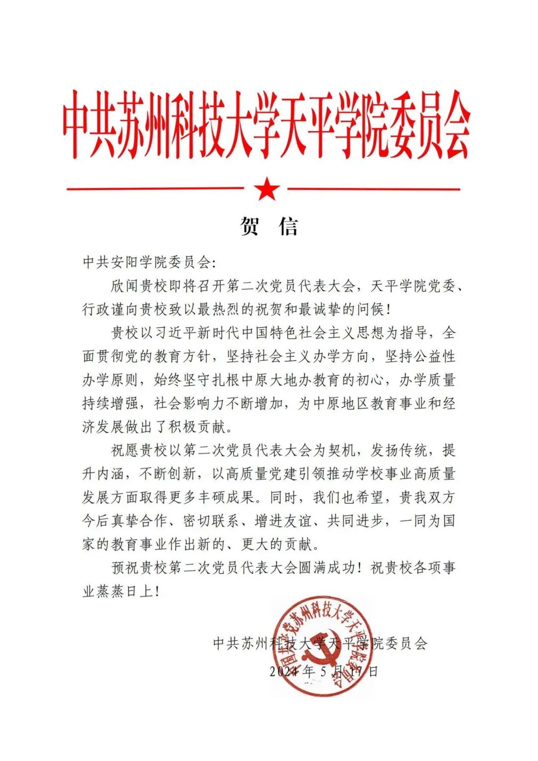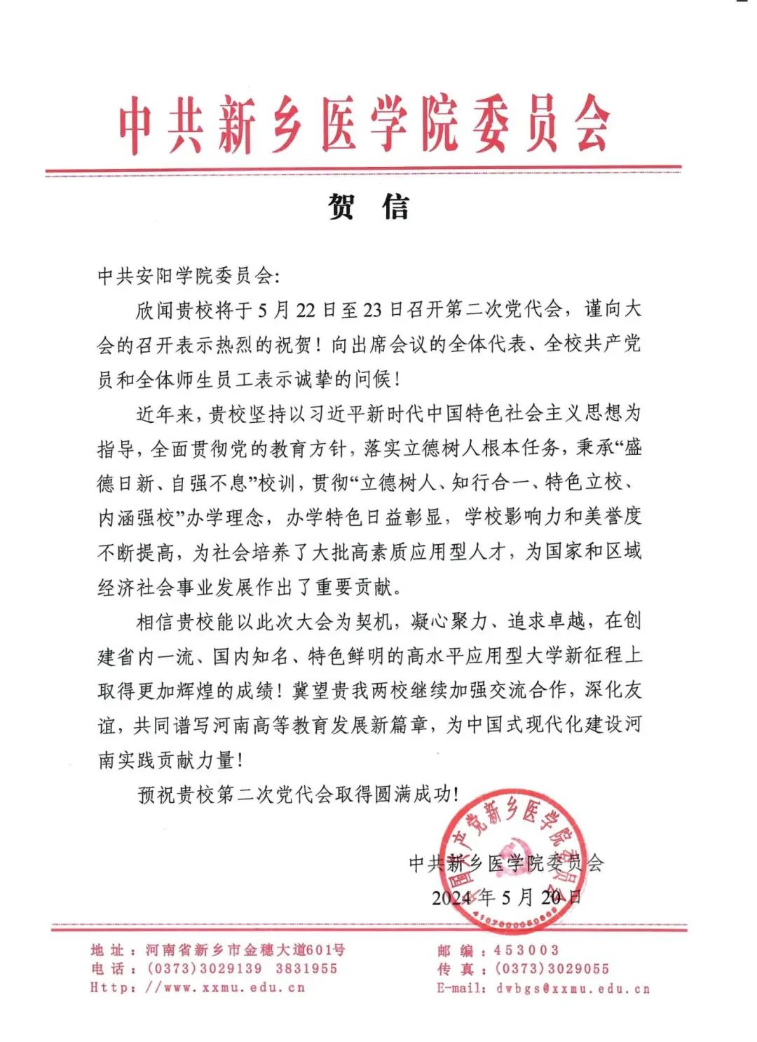 各高校在贺信中指出,本次大会是在喜迎新中国成立75周年,全党开展党纪学习教育之际,召开的一次非常重要的大会,具有承前启后、继往开来的意义。本次大会的胜利召开,必将进一步凝聚共识,激发伟力,不断推进学校事业高质量发展再上新台阶、再谱新篇章。全校师生定将在新一届党委领导班子的带领下,踔厉奋发、锐意进取,为加快建设省内一流、国内知名,特色鲜明的高水平应用型大学而努力奋斗!