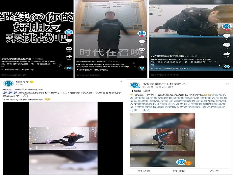 为促进广大学生疫情防控期间身心健康发展,做好学生居家体育锻炼和科学用眼保护视力工作,航空工程学院、计算机科学与技术学院通过QQ、抖音、微博、微信公众号等线上公众平台面向全院师生开展了“航空、计科居家运动挑战赛”线上活动。