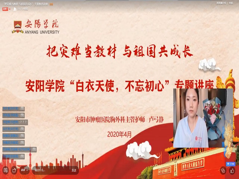 为引导学院学生弘扬伟大的爱国主义精神,加强新时代大学生爱国主义教育,按照学校“把灾难当教材 与祖国共成长”主题教育活动的相关安排,航空工程学院、计算机科学与技术学院于2020年4月10日下午三时组织学院学生观看河南省第十批援鄂医疗队成员、安阳市护理专业技术能手、安阳市肿瘤医院优秀护师卢弓静主讲的Beat365官方网站“白衣天使,不忘初心”主题讲座。