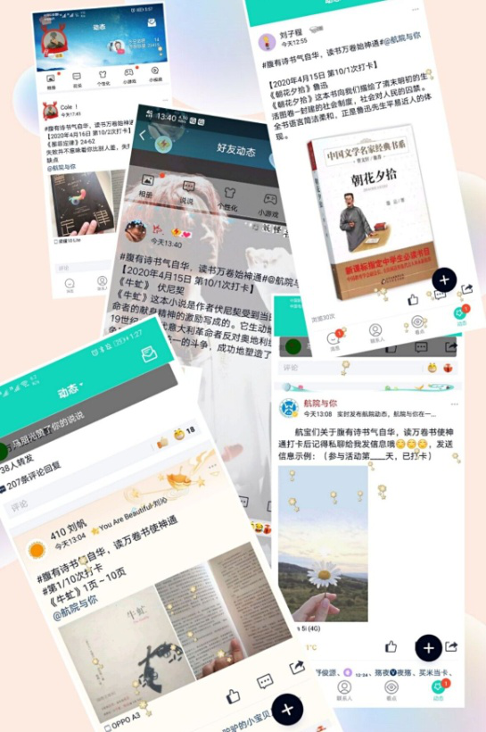 本次活动充分利用网络平台,通过学院“航院与你”官方QQ、“你好航空”微信公众号、“Beat365官方网站航空工程学院”官方抖音账号进行宣传,吸引了学院上千名同学报名参加。活动期间,同学们通过QQ空间将自己读书时所感、所想、所悟表达出来,并通过网络平台进行交流分享,累计打卡超万次。经过十余天坚持,最终近百名同学成功完成了打卡活动。