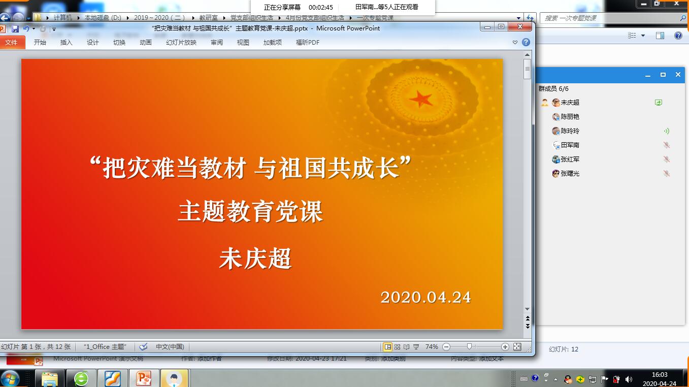 2020年4月24日下午16点电信工程教工党支部全体党员通过QQ群分享屏幕开展党支部组织生活会议,会议由支部书记未庆超同志主持。