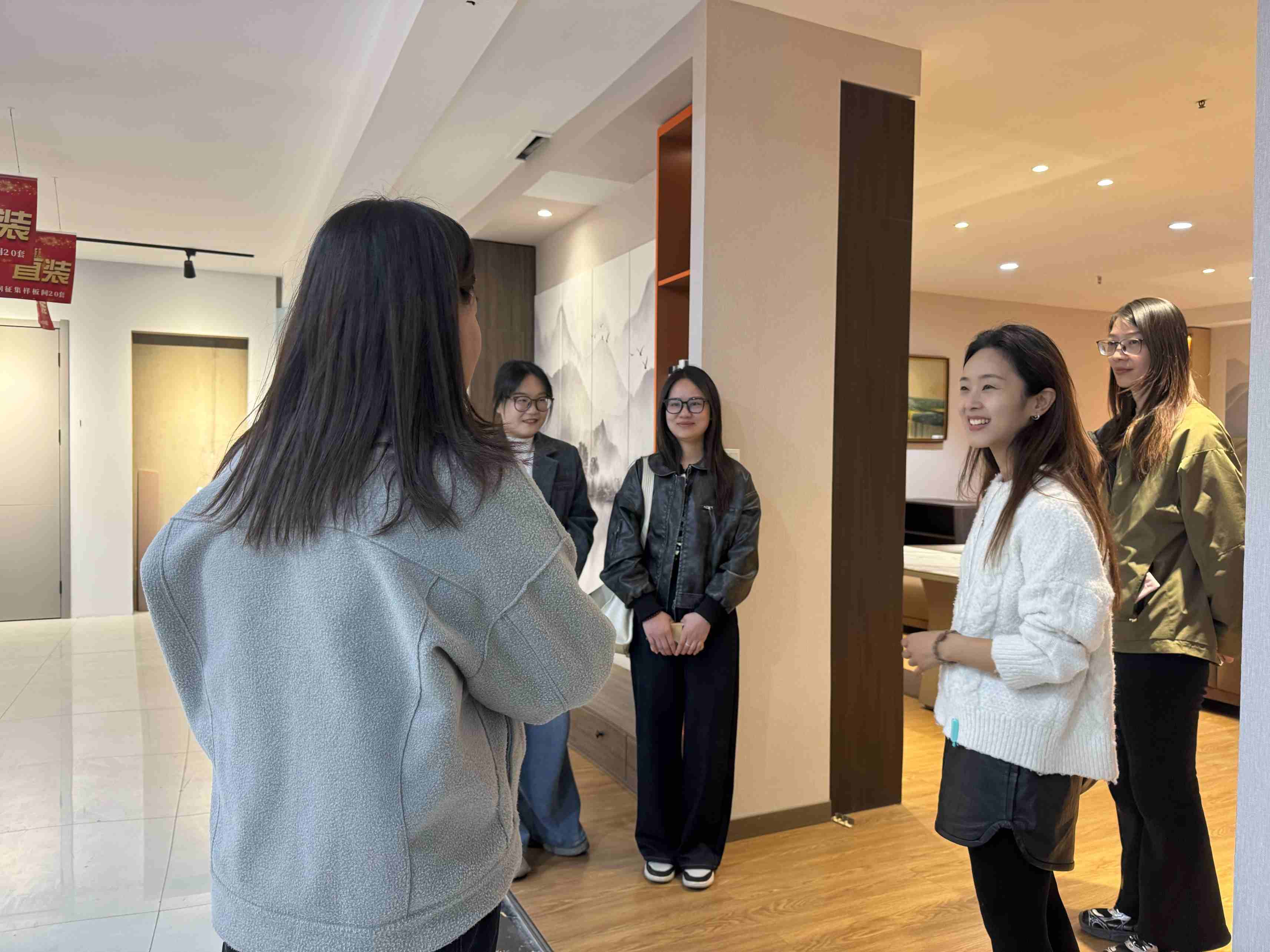 百度景象装饰公司负责人对教师们的到来表示热烈欢迎,先后带教师们参观了公司的办公环境、材料展厅及样板房,近距离感受公司特色,并简要介绍了公司25年来的发展历程、业务范围、设计理念以及未来规划。该公司自1999年进入建材行业,坚持工厂直营,先后服务过安阳市文字博物馆、曹操高陵、市民之家等3000多用户,很多客户由陌生变成朋友。交流中,企业负责人讲述了目前的用人需求和现状,企业较难招聘到合适的人,很多学生也很难找到合适的工作,企业更需要踏实肯干的新人,学生需要更有成长机会的平台,而这需要双方都付出正向的努力。