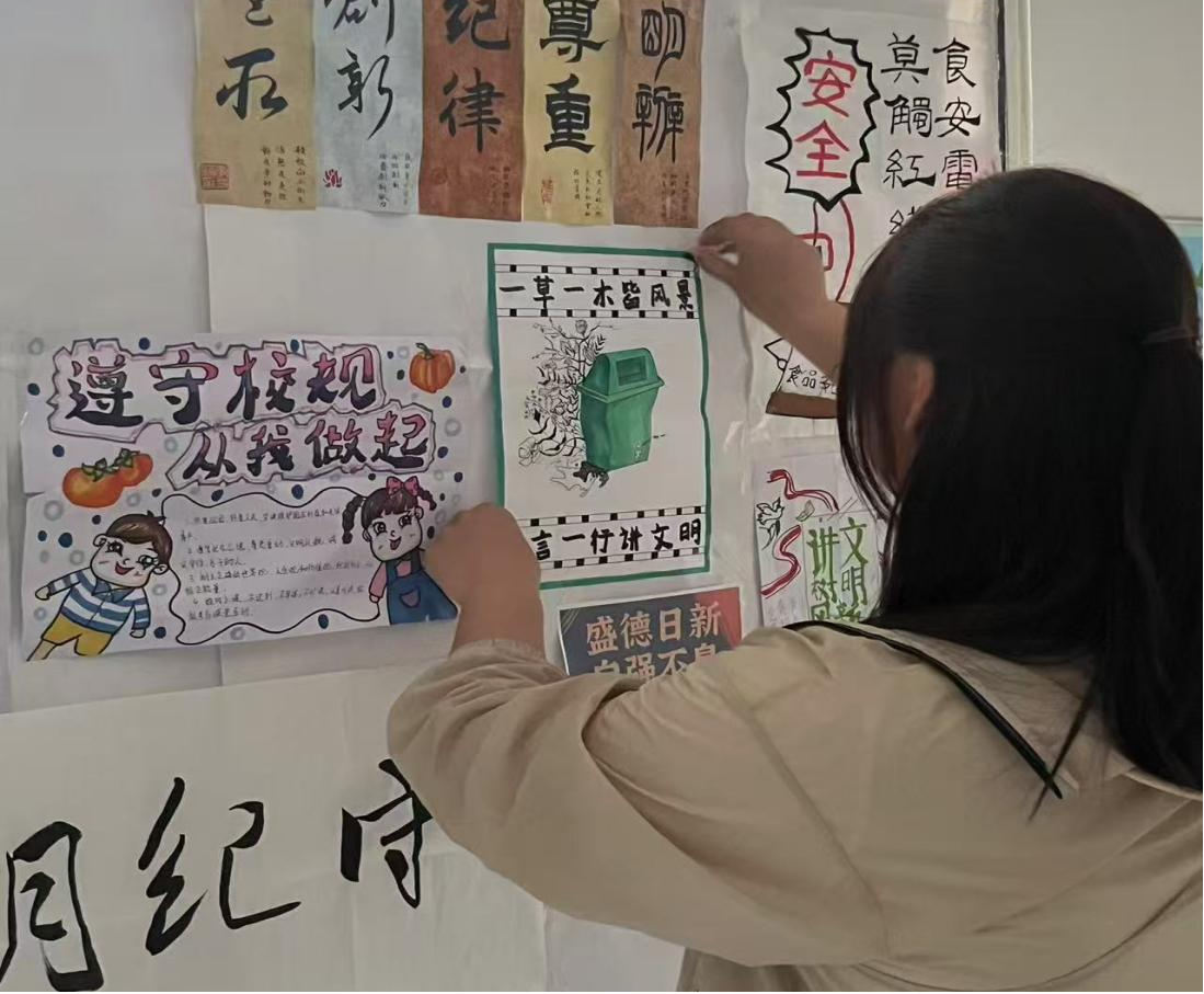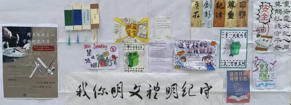活动伊始,同学们将专业特长与校规校纪内容深度融合,迸发无限创意:有的用细腻的水彩绘制校园文明场景,将课堂纪律、宿舍规范等要点融入清新画面;有的通过夸张的漫画风格,以幽默诙谐的方式展现违规行为的不良后果;还有人用书法的不同风格,来表现学校规则的严明。这些作品兼具艺术性与教育性,充分展现了美院学子的创新思维。在创作过程中,同学们不仅加深了对校规校纪的认识,更在团队合作中提升了沟通与协作能力。大家的作品设计完成后,学院从众多优秀作品中精心挑选,张贴至美术学院宣传栏处。富有设计感的宣传内容,吸引了众多同学驻足观看,让校规校纪以“润物细无声”的方式浸润师生心田。