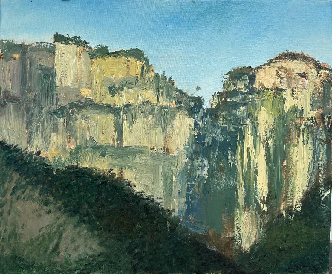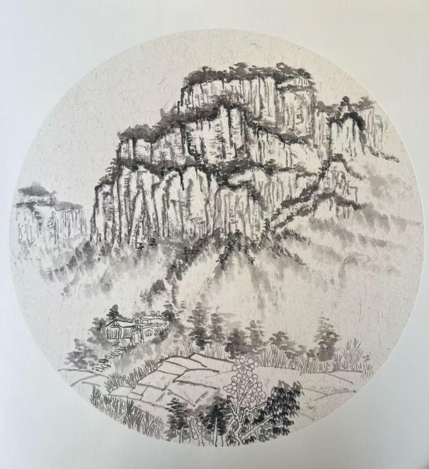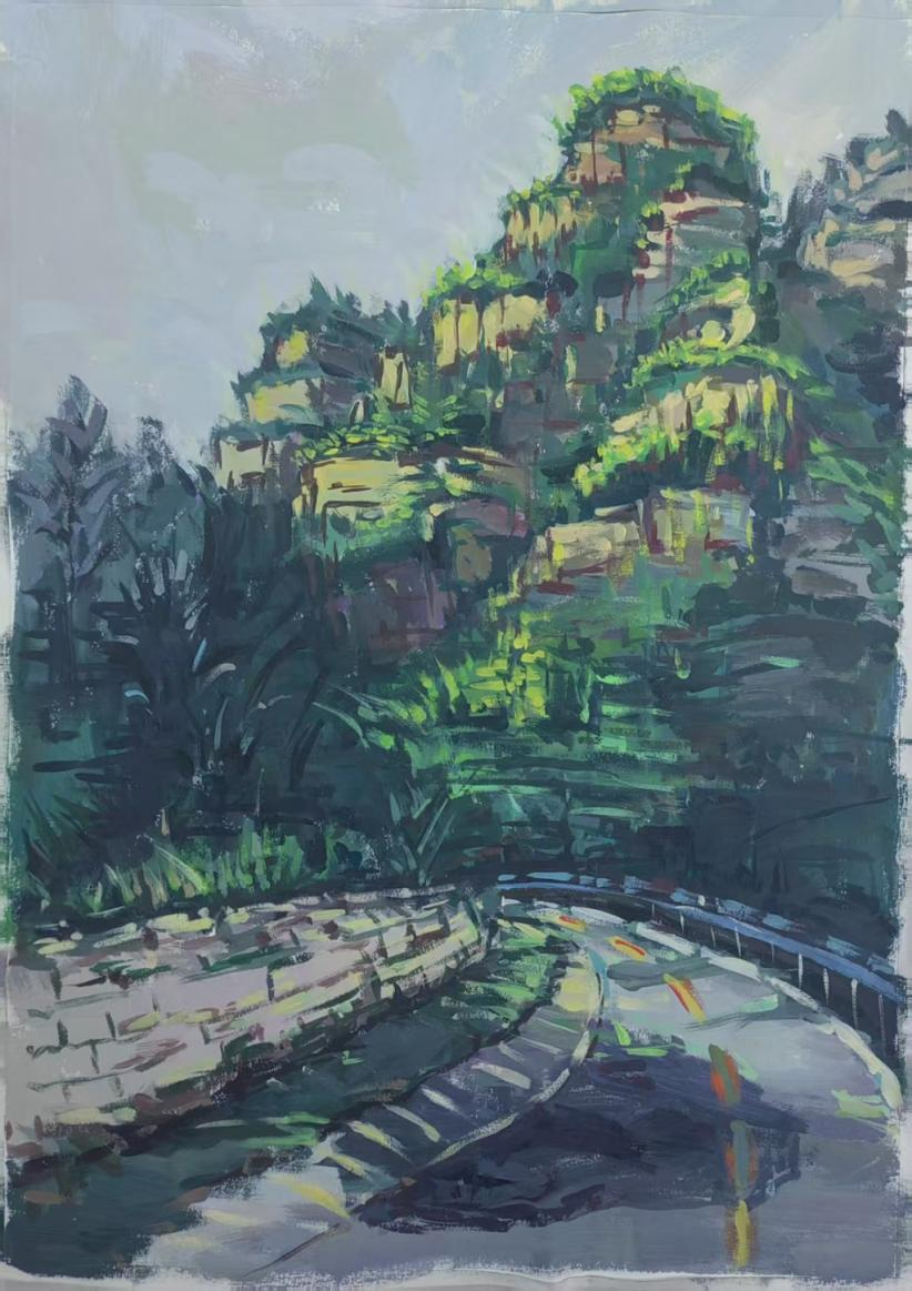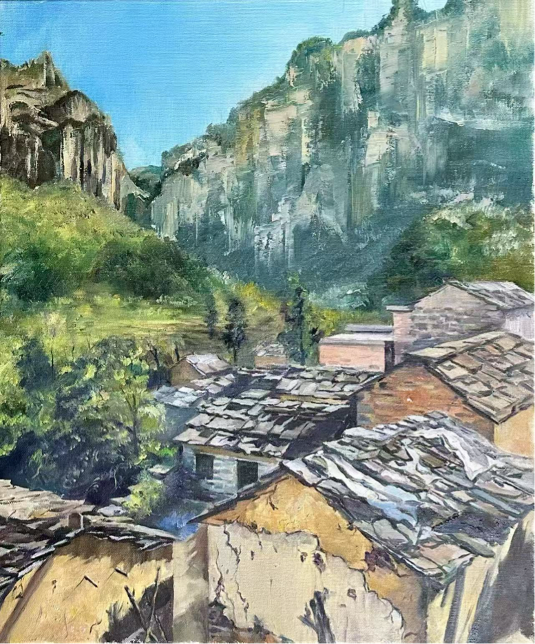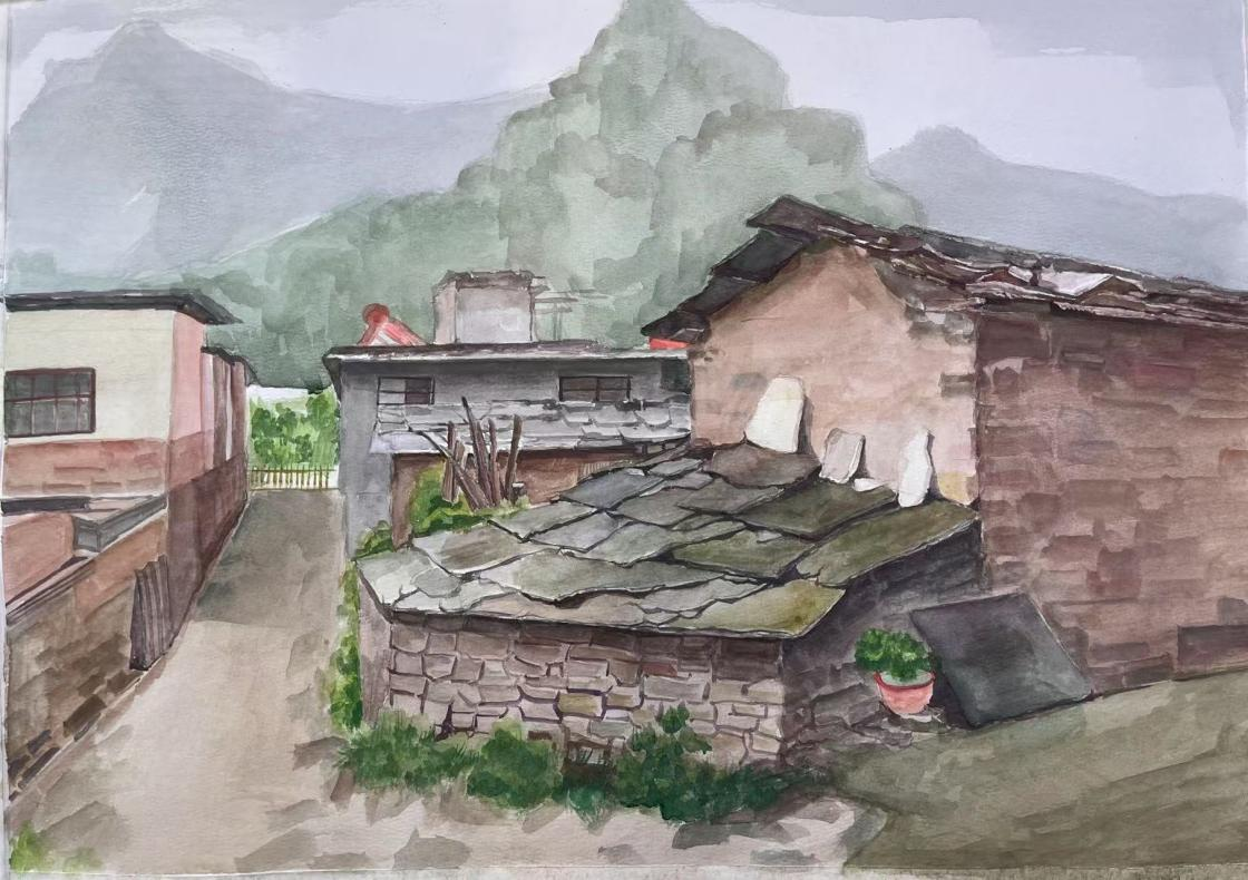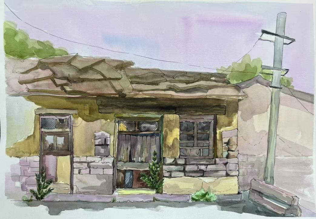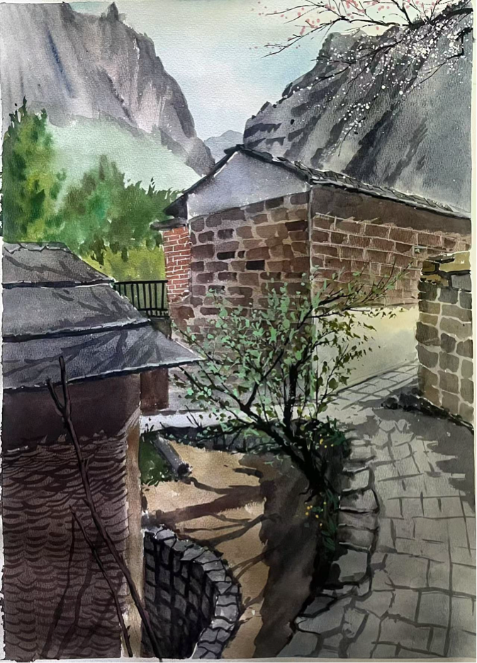 这座隐匿于太行山深处的古村落,以其独特的石板民居、层叠梯田与苍茫山色,为师生们提供了丰富的创作素材与灵感源泉。井底村被誉为“太行山最后的秘境”,其依山而建的石头院落、蜿蜒的挂壁公路、晨昏变幻的云海山岚,成为师生们笔下的焦点。写生期间,同学们白天分组深入村落写生,晚间由老师集中点评作品,通过“观察—创作—反思”的循环实践,深化了对光影、构图与地域性美学特征的理解。