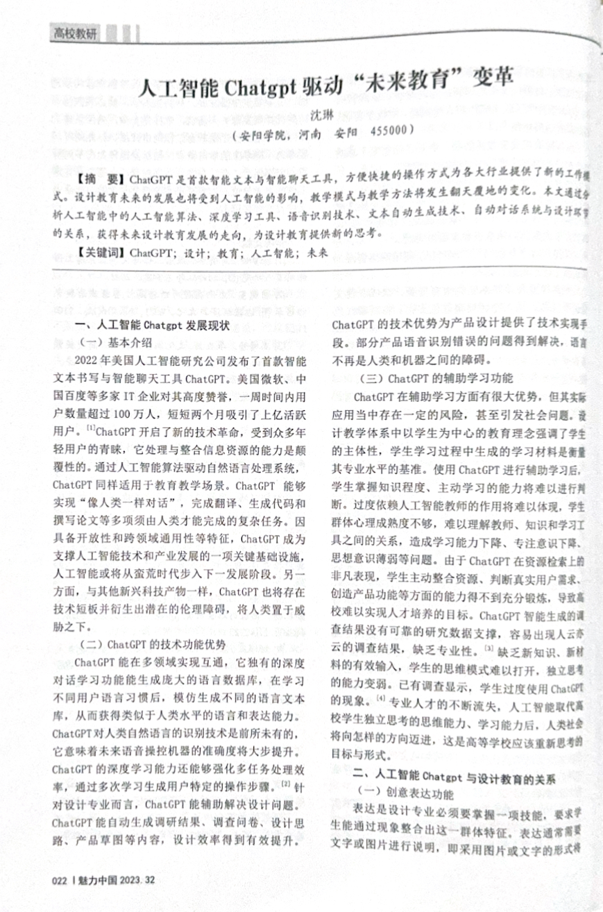 美术学院教师沈琳老师发表论文 人工智能Chatgpt驱动“未来设计教育”变革