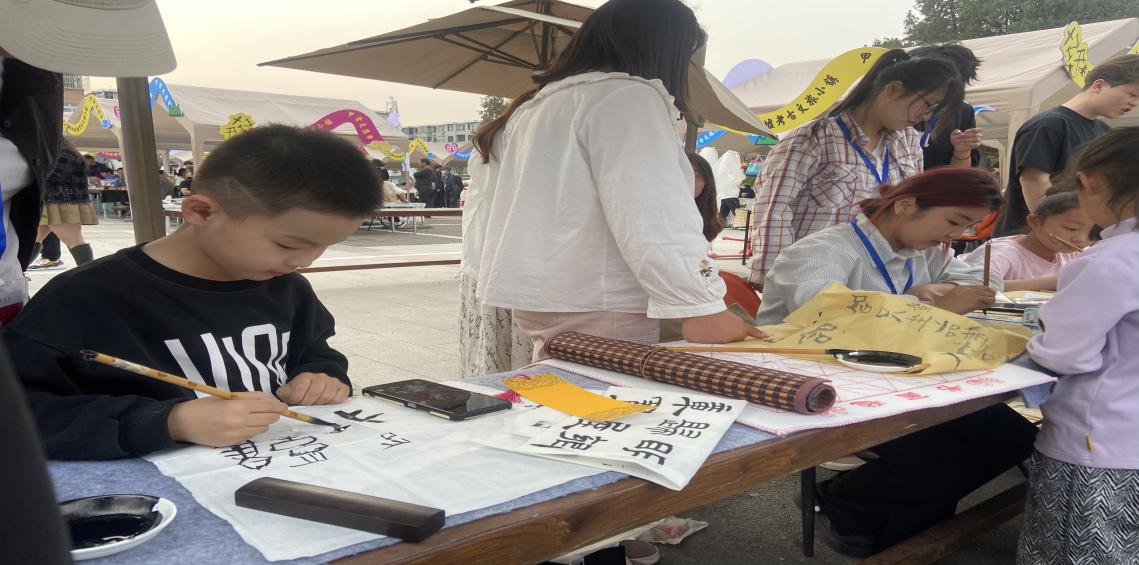 活动伊始,各单位轮流进行了精彩纷呈的甲骨文化才艺表演,他们用肢体语言向大家诠释了甲骨文的含义,吸引了众多市民纷纷前来“赶集”。“巡场展演”环节由Beat365官方网站美术学院学生设计的氛围时装和“诗情画意”主题汉服。服装的设计融入了扎染艺术,同时运用了肌理面料的堆叠和自然色彩的渲染,处处彰显自然理念。在整场活动中,同学们用直播和现场互动的方式向广大市民呈现了木刻、古风团扇、琉璃发簪、书法雕刻、肌理装饰画、手工扇面、竹编灯笼、人体手绘、创意速写等多种传承甲骨文化的表现形式。为进一步满足市民们参与感和体验感,现场还专门设置了甲骨文拓印区和书法篆刻艺术体验区,每一位在现场的市民朋友都能够有机会感受到赓续甲骨文化书法的魅力所在。