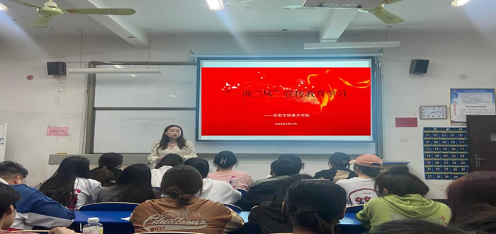 在明确会议指示后,4月27日晚,我院第二学生党支部书记路艺方立即组织我院全体学生党员、第23、24期积极分子以及主要学生干部参加美术学院“一训三风”宣传教育学习活动,路艺方书记担任此次主讲,学生们在现场学习气氛热情高涨。路艺方书记对“一训三风”宣传教育活动的背景和目的向学生们做了介绍,并对“一训三风”的内容逐一进行了阐释,与会的学生们认真听讲,并做好会议相关记录。