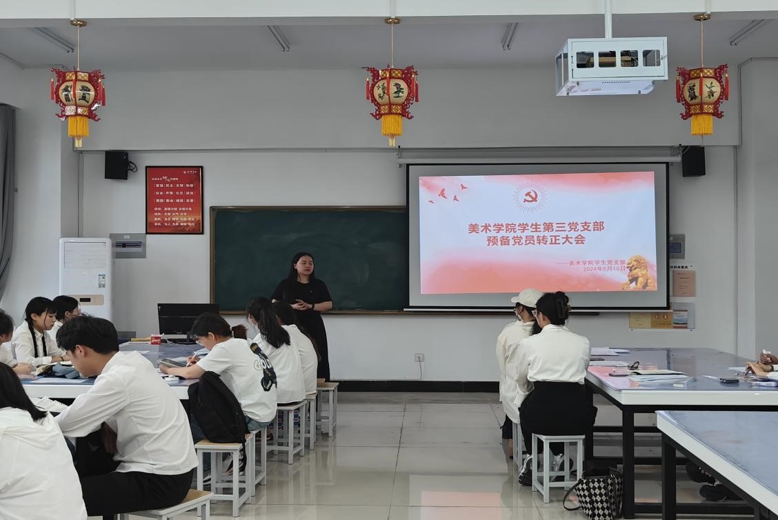 为进一步规范党员发展流程,提高党员发展质量,5月10日下午18点,美术学院学生第三党支部在A12-208召开预备党员转正大会,大会讨论了薛萌、郭雨彤、张继升等19位预备党员转正的相关事宜。参会人员有美术学院学生第一党支部书记兼党建办负责老师任飞,美术学院学生第三党支部书记张译,以及美术学院学生第三党支部学生,会议由学生第三党支部书记张译主持。
