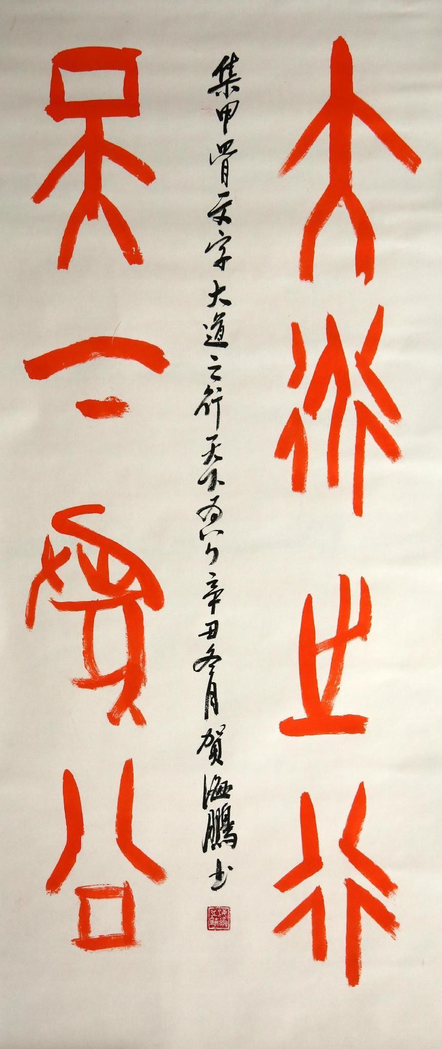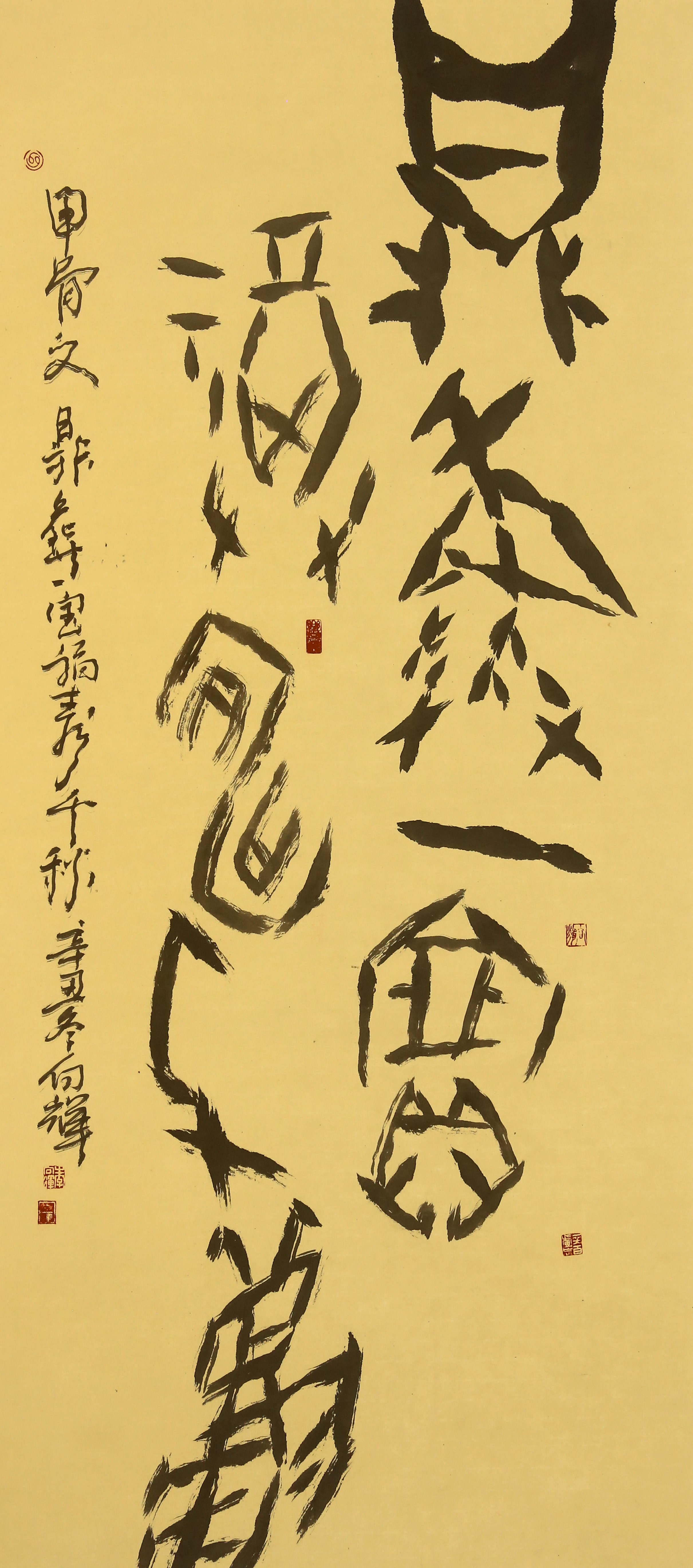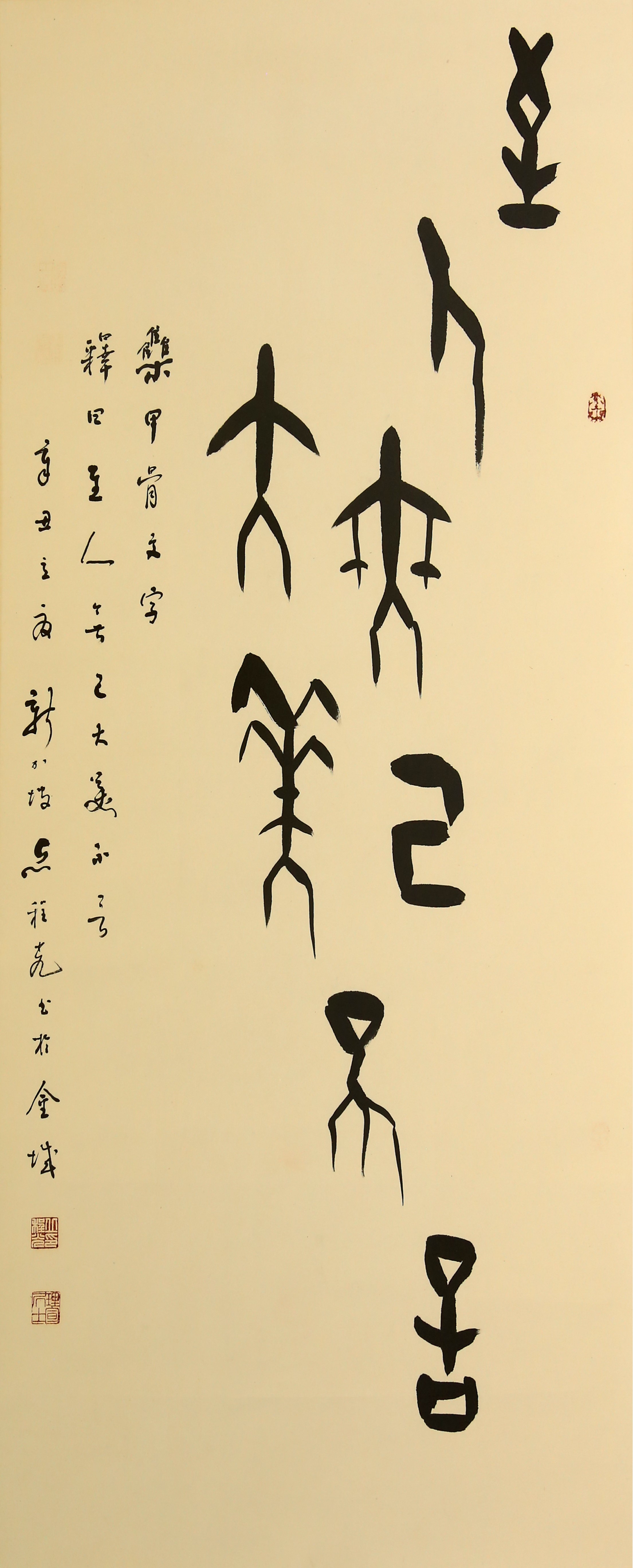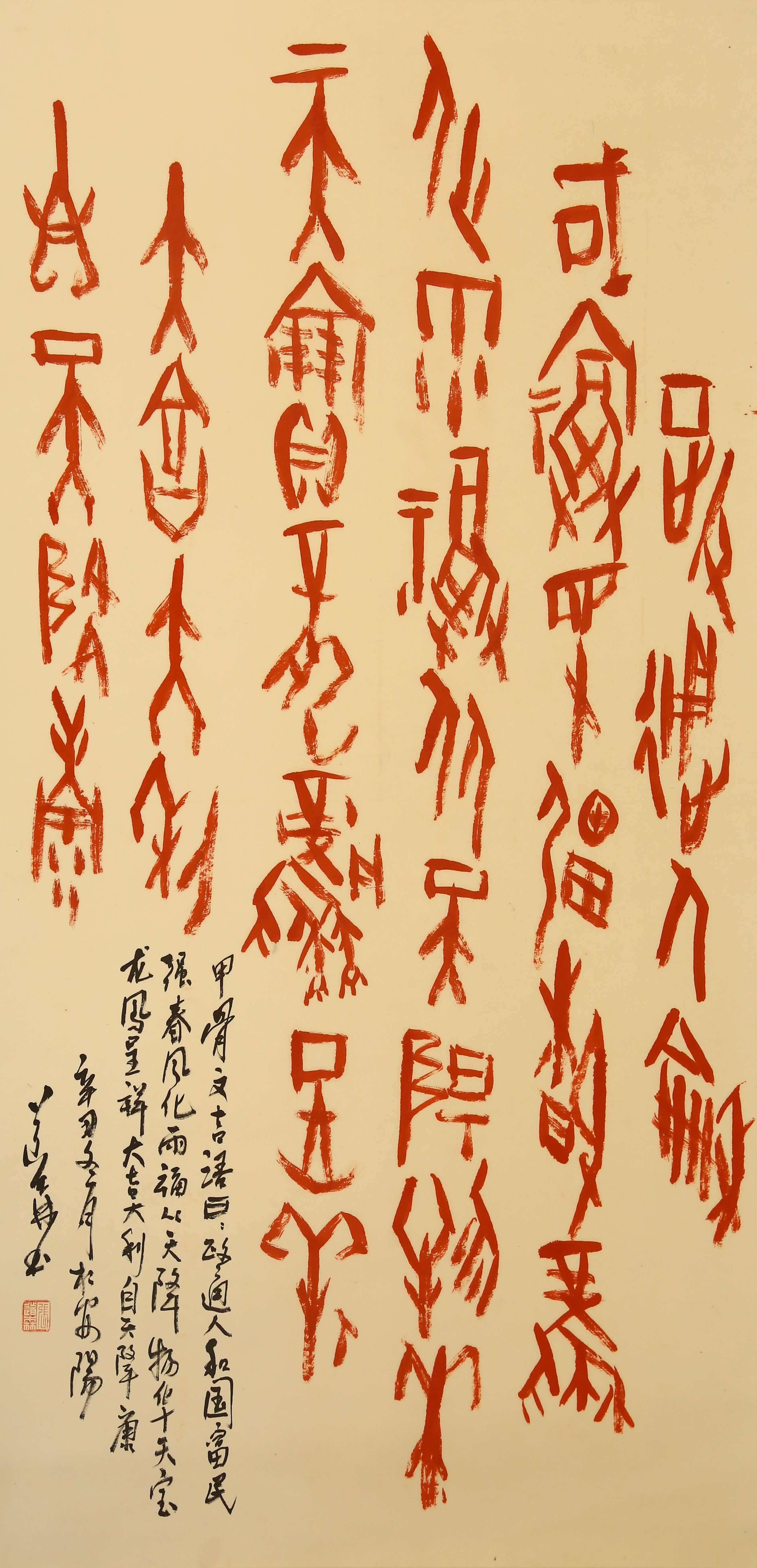把文字进行造型艺术的表现是甲骨文艺术独特的语言,是争得汉字在海外话语权的优势与历史职责。甲骨文书法艺术是世界容易接纳的艺术,它依据汉字独特的结体造型、极具生命意识的线条,丰富多彩的章法,以及所蕴含的历史与人文内涵,得到人们喜爱。世界上没有一种文字像甲骨文这样能进入造型艺术的表现。它是汉字的鼻祖,它是人类至今唯一没有失传且延续至今的文字,它是人文与历史含量最厚重的载体,是全人类的骄傲。