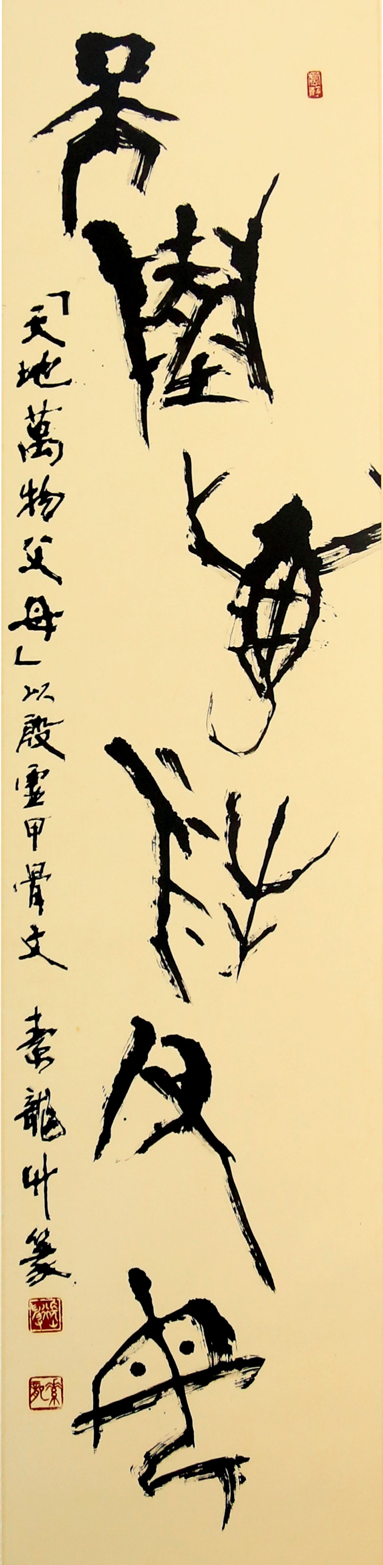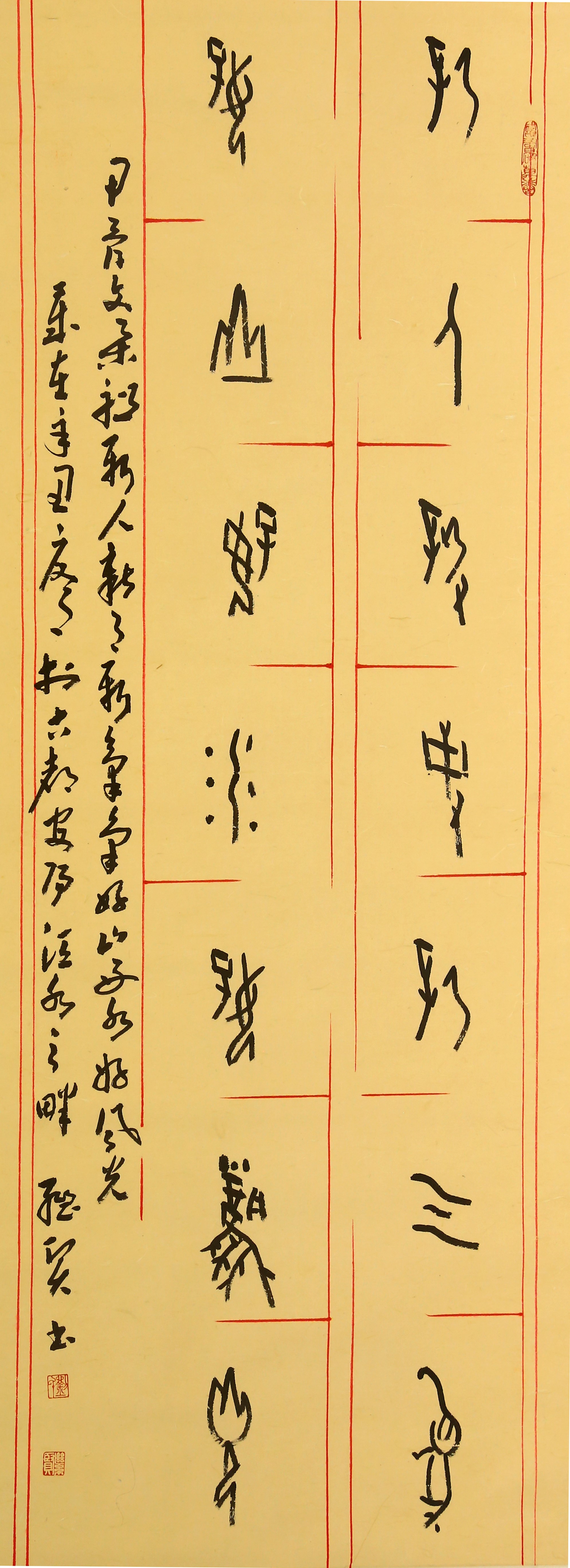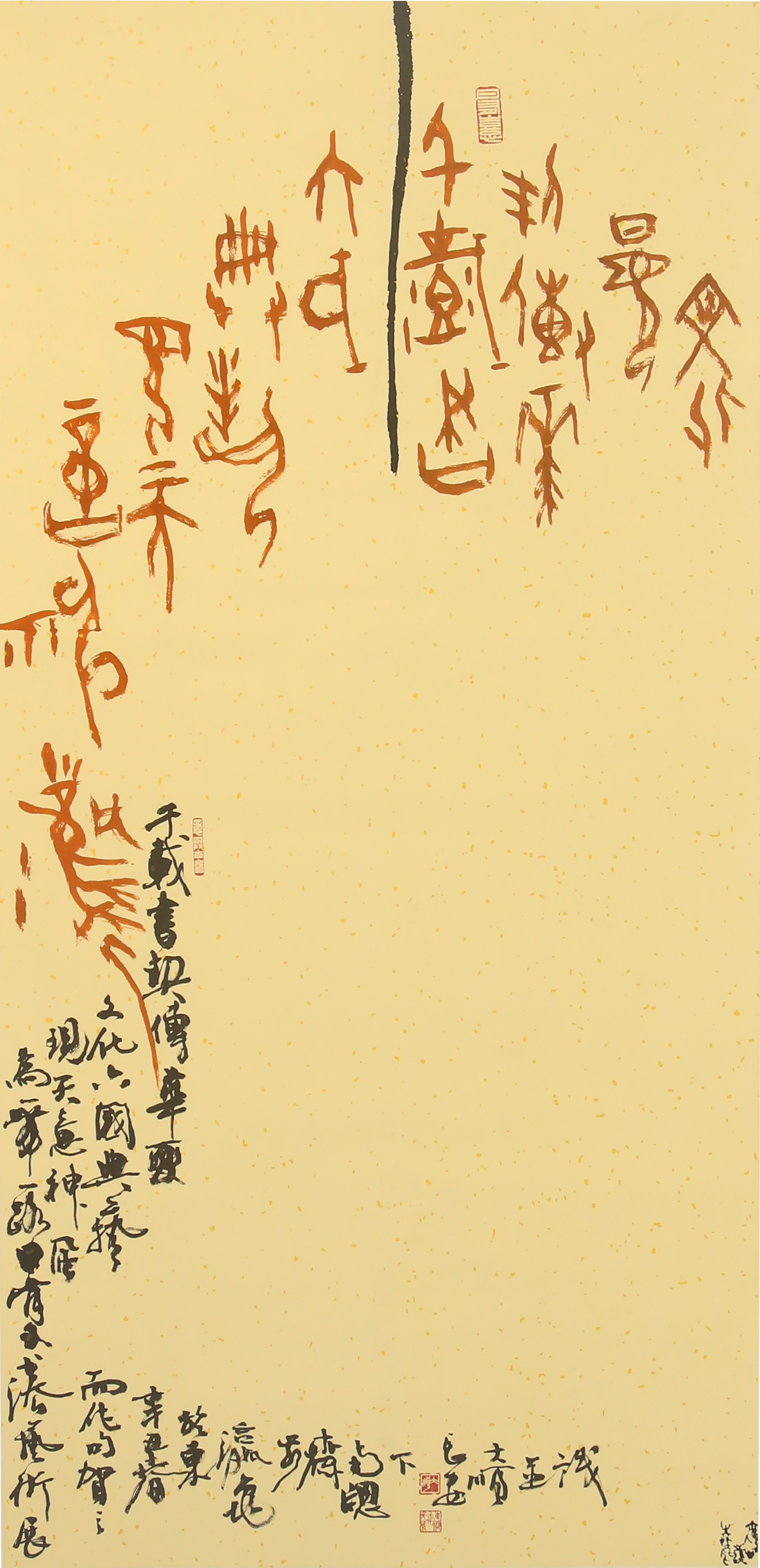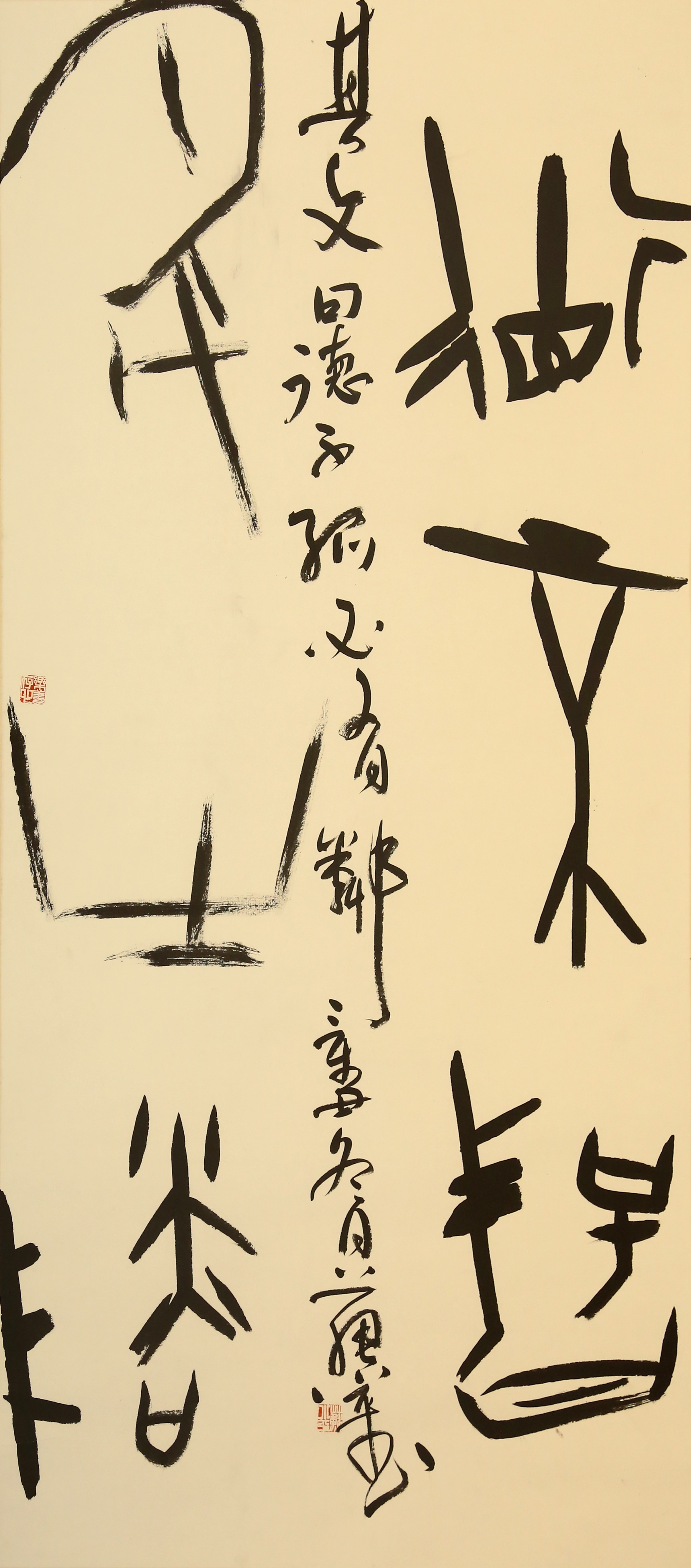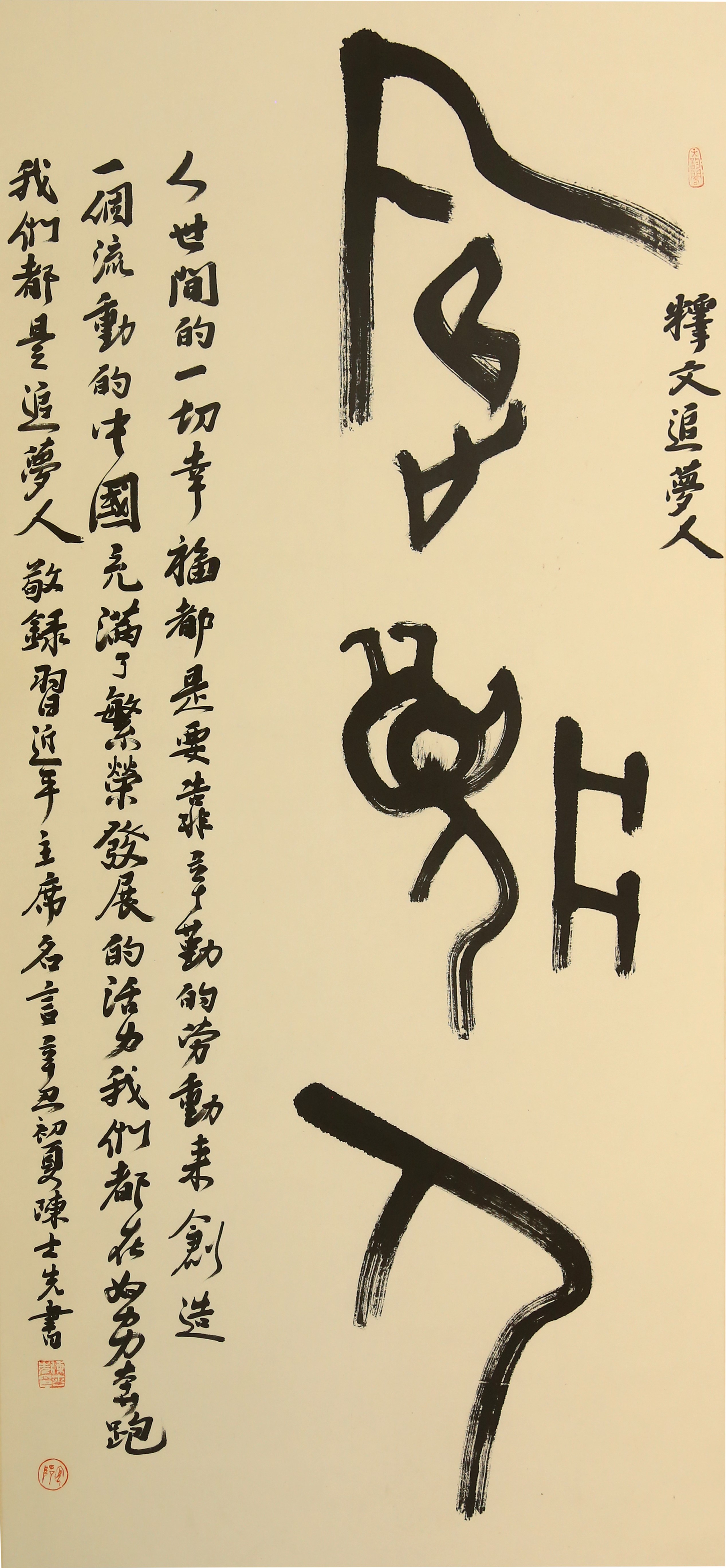 把文字进行造型艺术的表现是甲骨文艺术独特的语言,是争得汉字在海外话语权的优势与历史职责。甲骨文书法艺术是世界容易接纳的艺术,它依据汉字独特的结体造型、极具生命意识的线条,丰富多彩的章法,以及所蕴含的历史与人文内涵,得到人们喜爱。世界上没有一种文字像甲骨文这样能进入造型艺术的表现。它是汉字的鼻祖,它是人类至今唯一没有失传且延续至今的文字,它是人文与历史含量最厚重的载体,是全人类的骄傲。