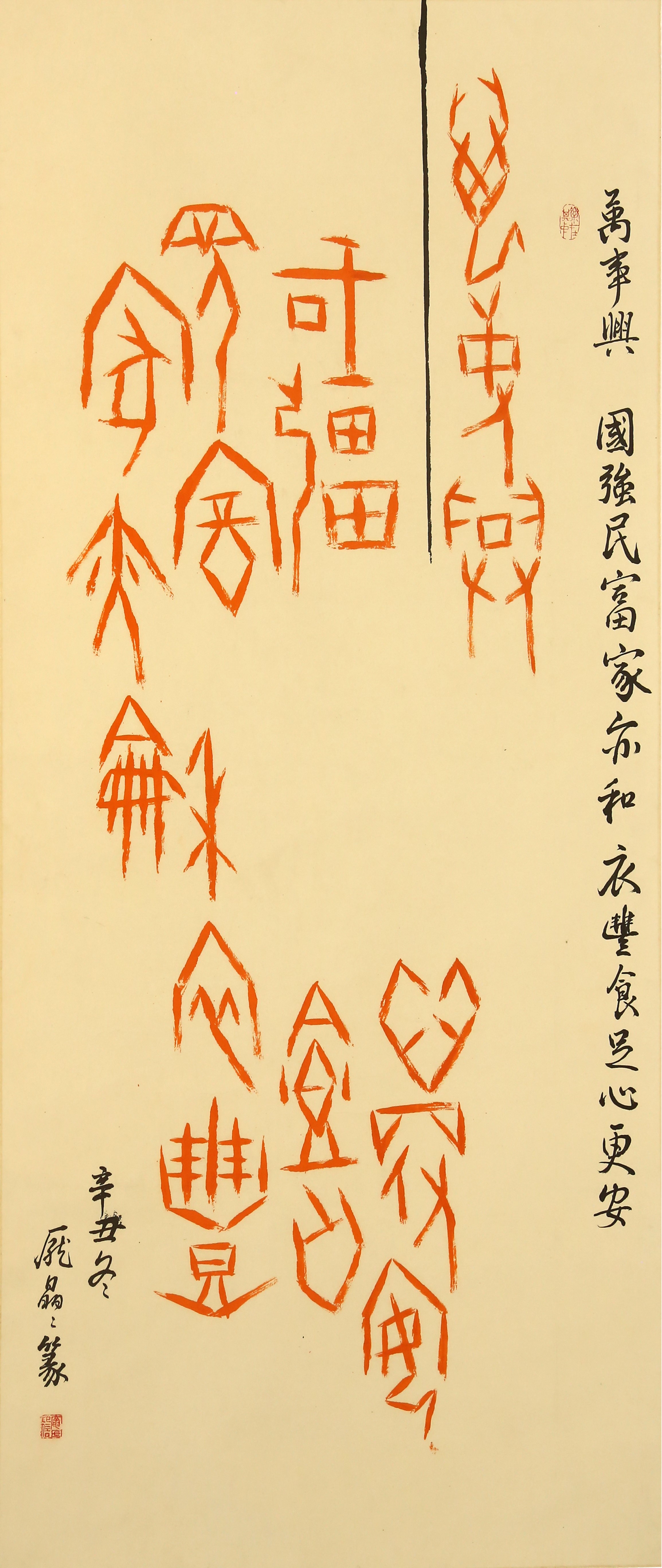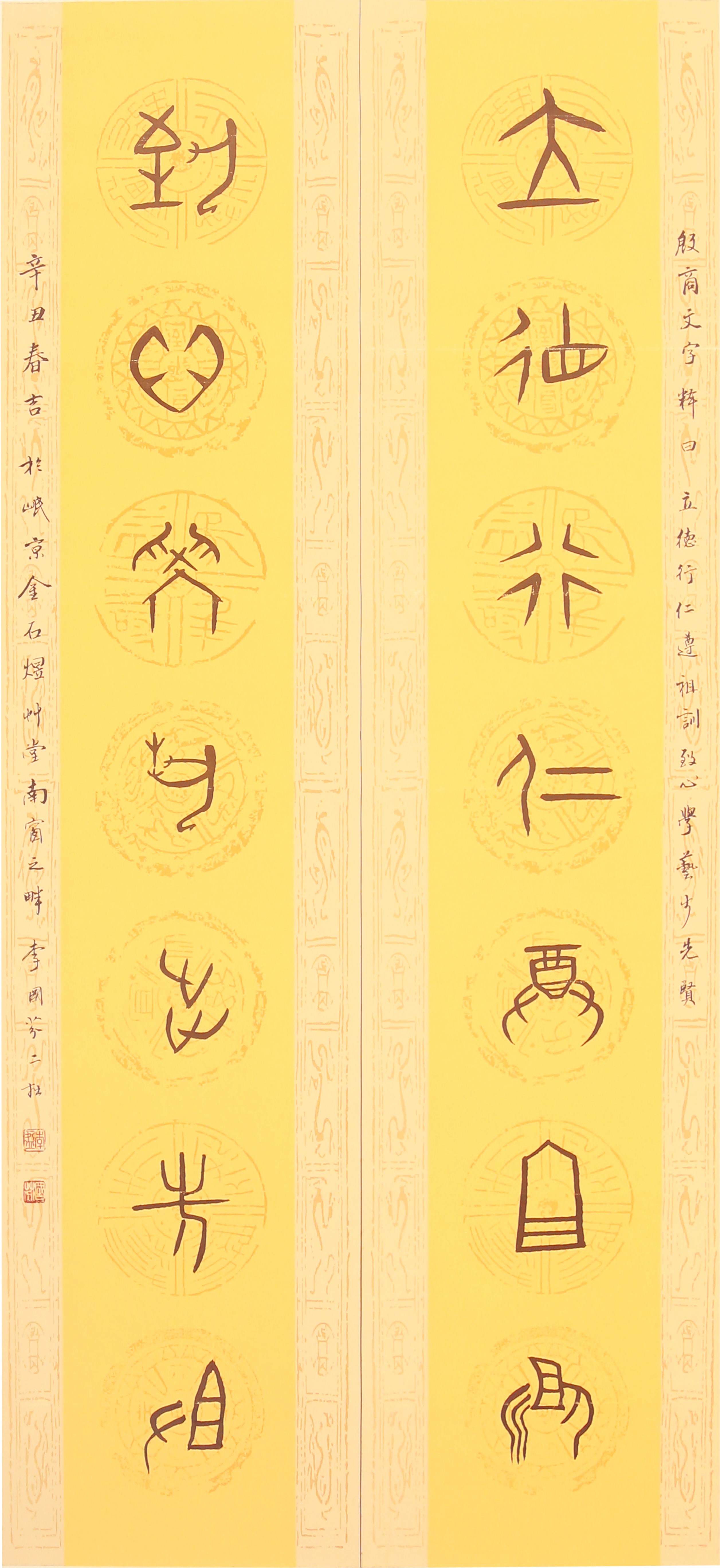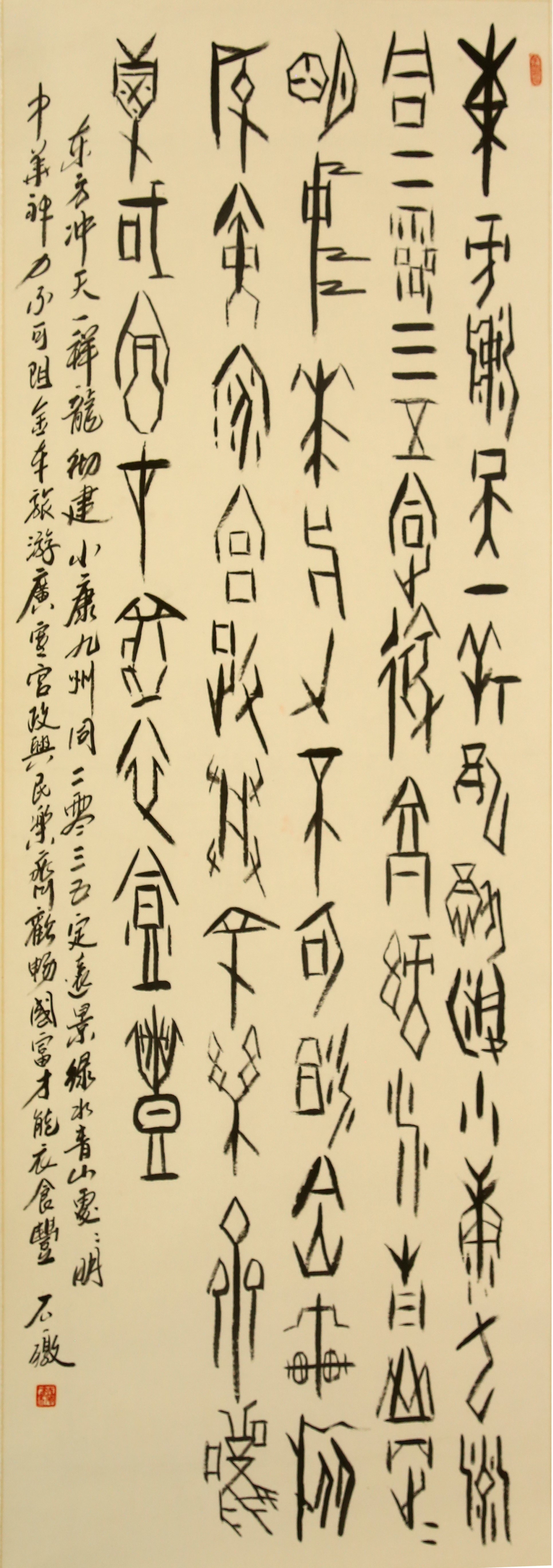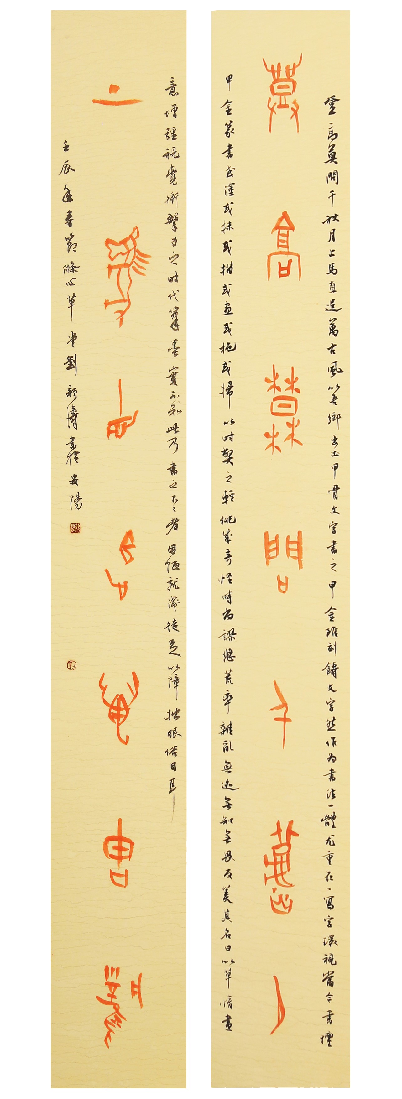 把文字进行造型艺术的表现是甲骨文艺术独特的语言,是争得汉字在海外话语权的优势与历史职责。甲骨文书法艺术是世界容易接纳的艺术,它依据汉字独特的结体造型、极具生命意识的线条,丰富多彩的章法,以及所蕴含的历史与人文内涵,得到人们喜爱。世界上没有一种文字像甲骨文这样能进入造型艺术的表现。它是汉字的鼻祖,它是人类至今唯一没有失传且延续至今的文字,它是人文与历史含量最厚重的载体,是全人类的骄傲。