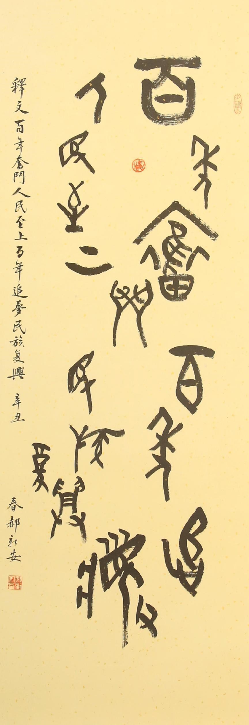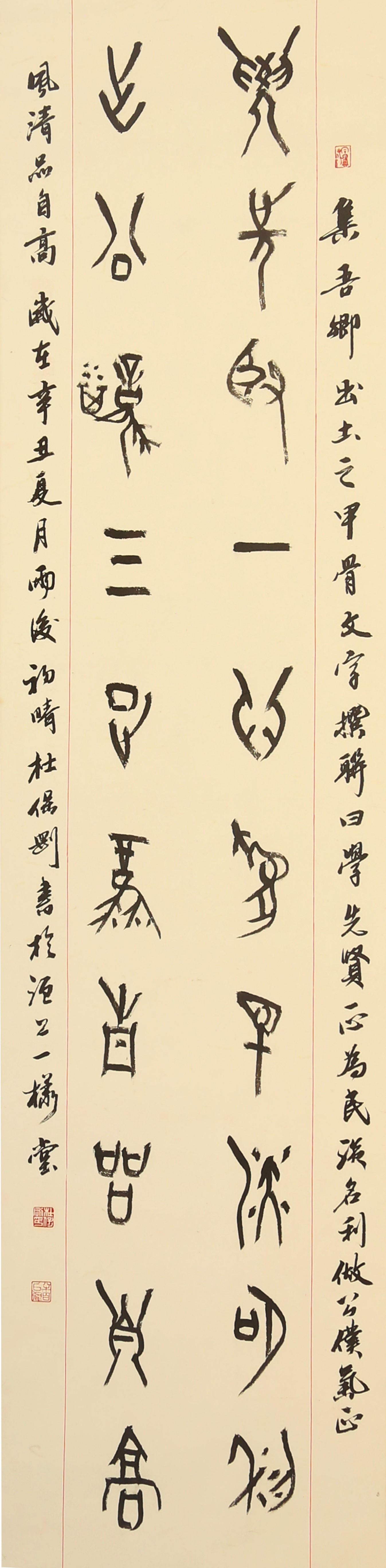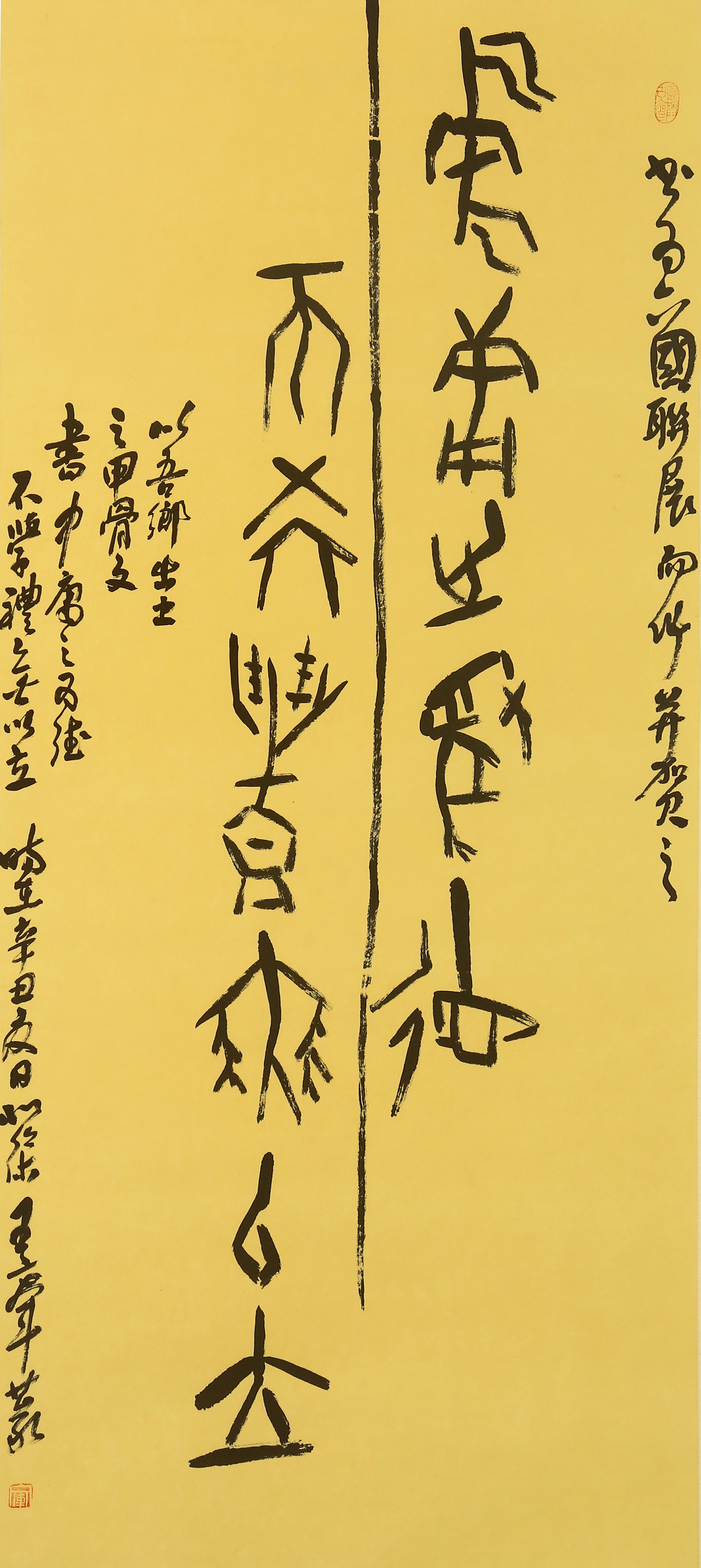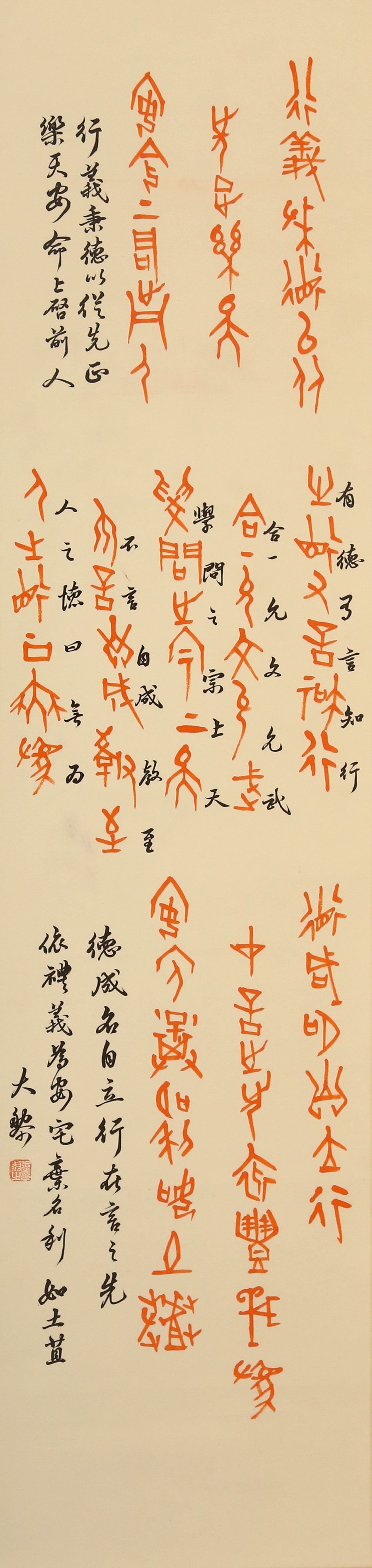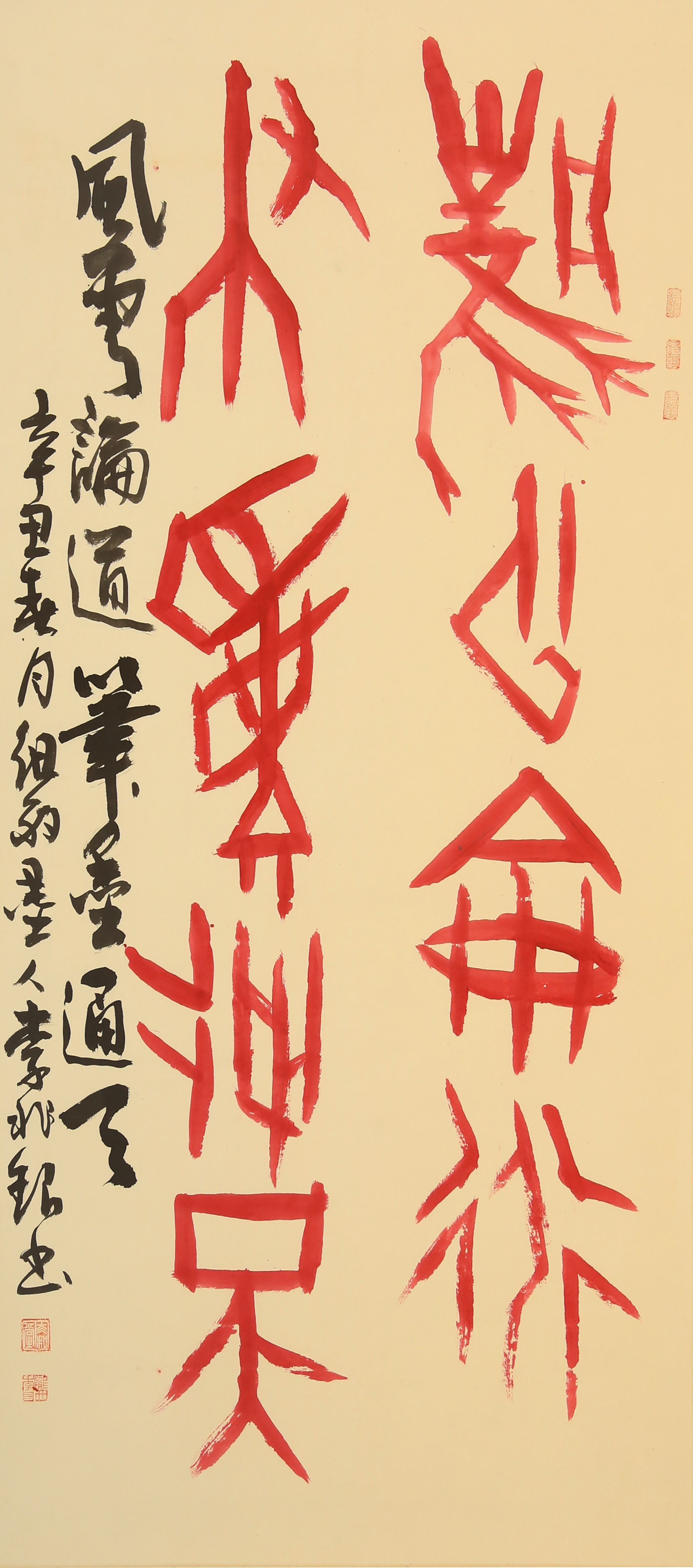 把文字进行造型艺术的表现是甲骨文艺术独特的语言,是争得汉字在海外话语权的优势与历史职责。甲骨文书法艺术是世界容易接纳的艺术,它依据汉字独特的结体造型、极具生命意识的线条,丰富多彩的章法,以及所蕴含的历史与人文内涵,得到人们喜爱。世界上没有一种文字像甲骨文这样能进入造型艺术的表现。它是汉字的鼻祖,它是人类至今唯一没有失传且延续至今的文字,它是人文与历史含量最厚重的载体,是全人类的骄傲。