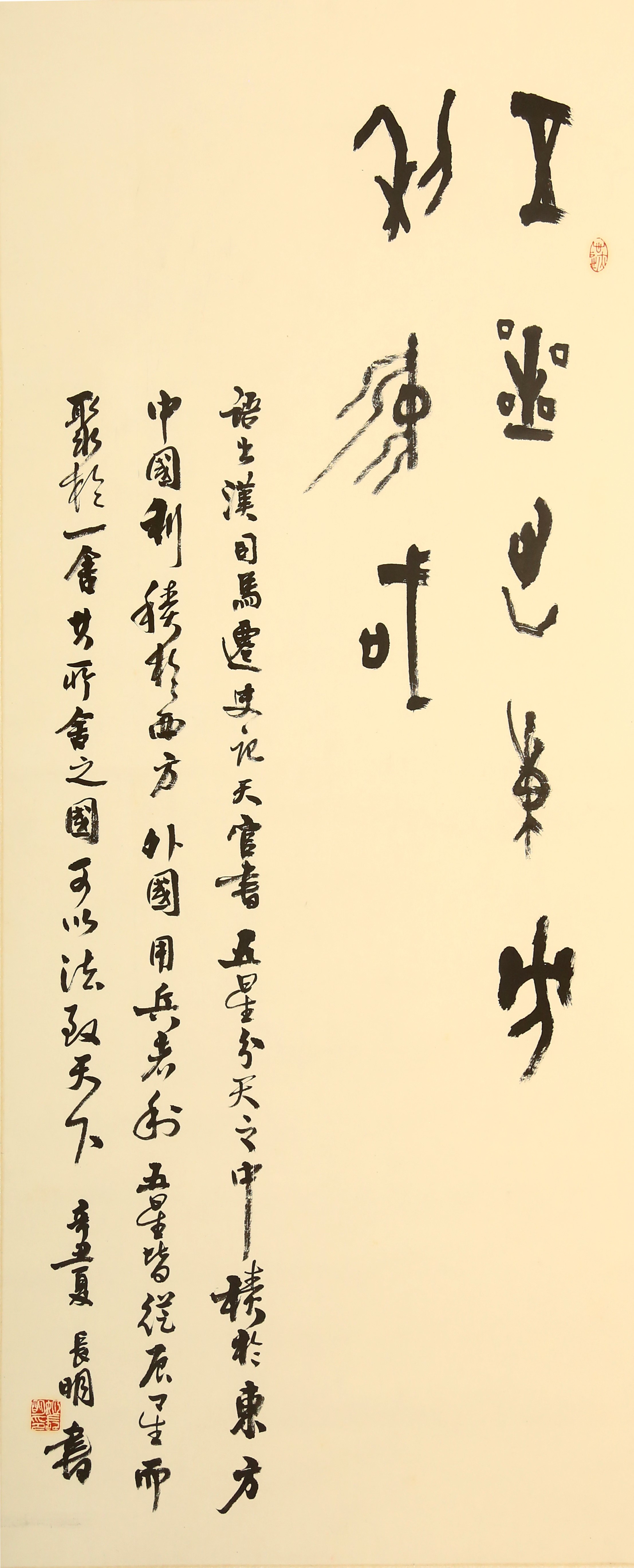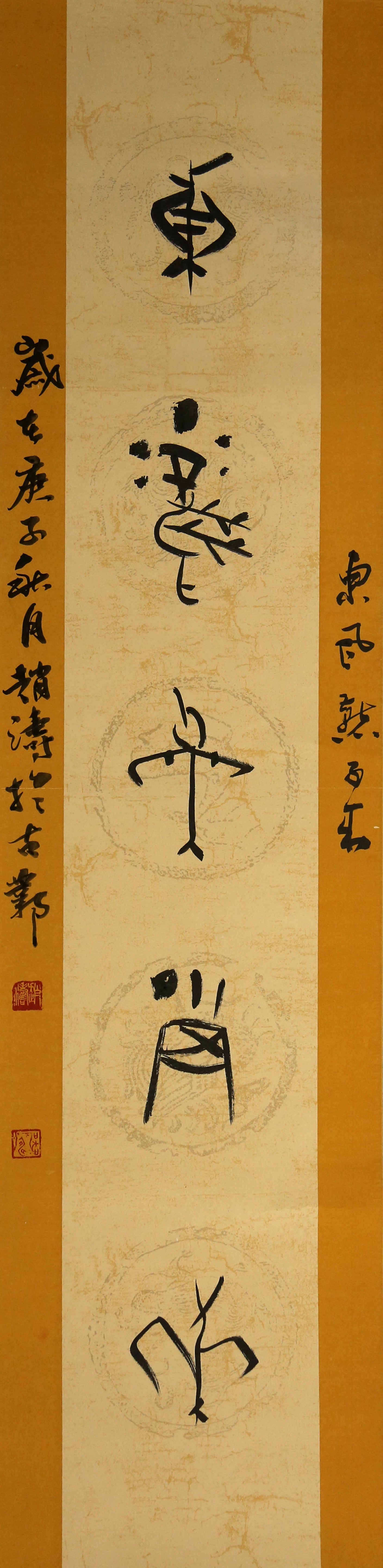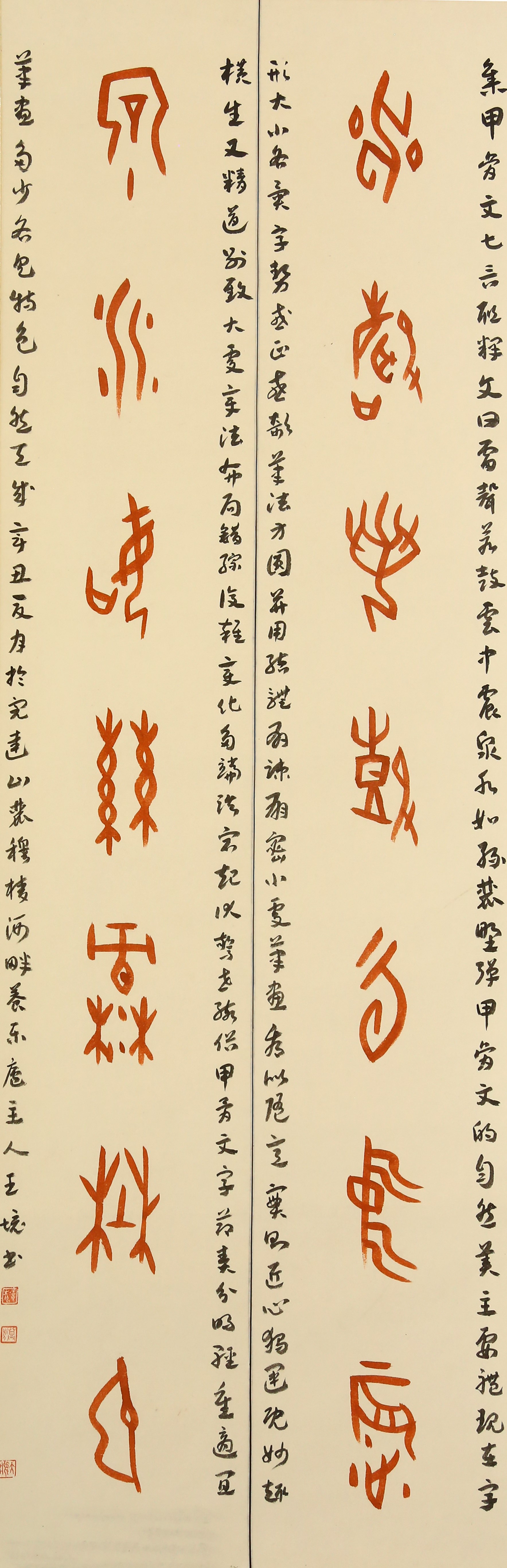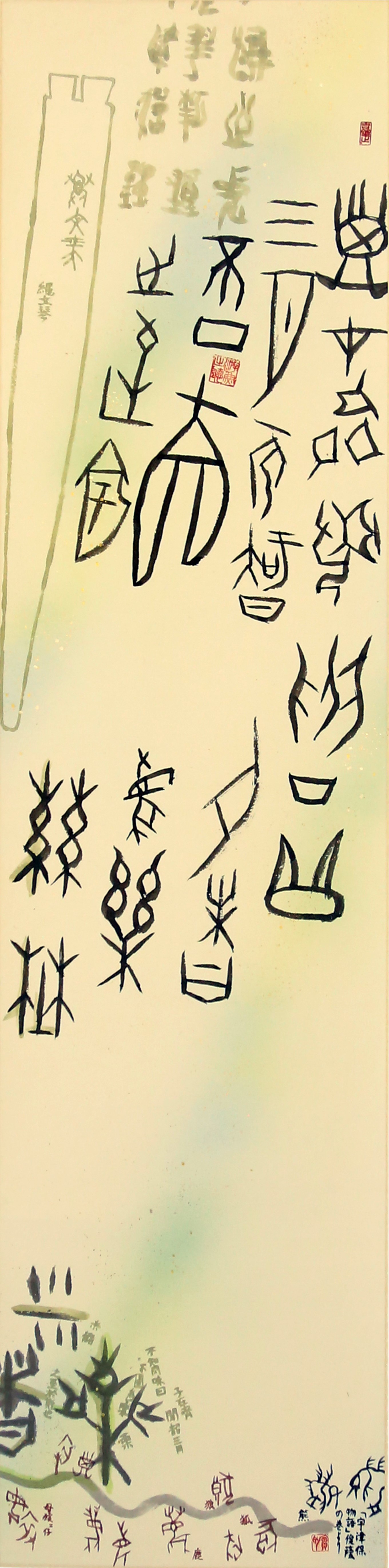 把文字进行造型艺术的表现是甲骨文艺术独特的语言,是争得汉字在海外话语权的优势与历史职责。甲骨文书法艺术是世界容易接纳的艺术,它依据汉字独特的结体造型、极具生命意识的线条,丰富多彩的章法,以及所蕴含的历史与人文内涵,得到人们喜爱。世界上没有一种文字像甲骨文这样能进入造型艺术的表现。它是汉字的鼻祖,它是人类至今唯一没有失传且延续至今的文字,它是人文与历史含量最厚重的载体,是全人类的骄傲。