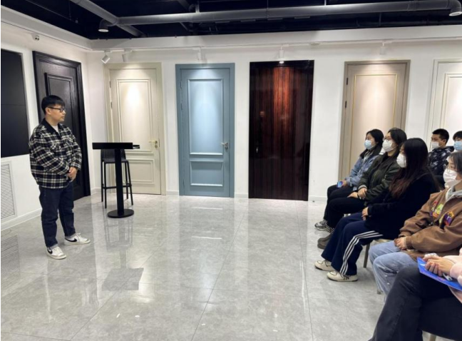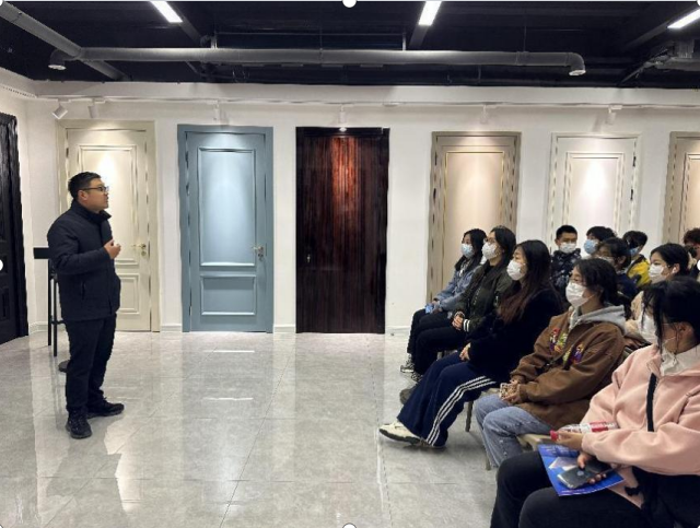 为让学生更加了解室内设计市场以及市场所需专业型人才,公司首先邀请行政、工程部经理王兵为大家现场讲解品牌发展历程与品牌优势、新媒体部经理王磊为大家讲述新媒体对行业发展的重要性,随后由设计部经理王娜带领同学们进入展厅,现场进行案例讲解与工艺分析,使学生对室内设计行业有更加深入的了解与学习,最后,对学生提出的行业相关知识的疑问进行了解答。