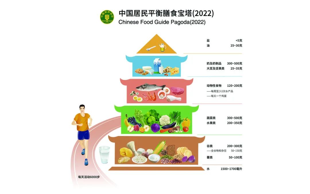 中国营养学会发布的中国居民平衡膳食宝塔(2022),把均衡饮食的原则转化为各类食物的重量,并以直观的宝塔形式表现出来,便于大家理解和在日常生活中应用。