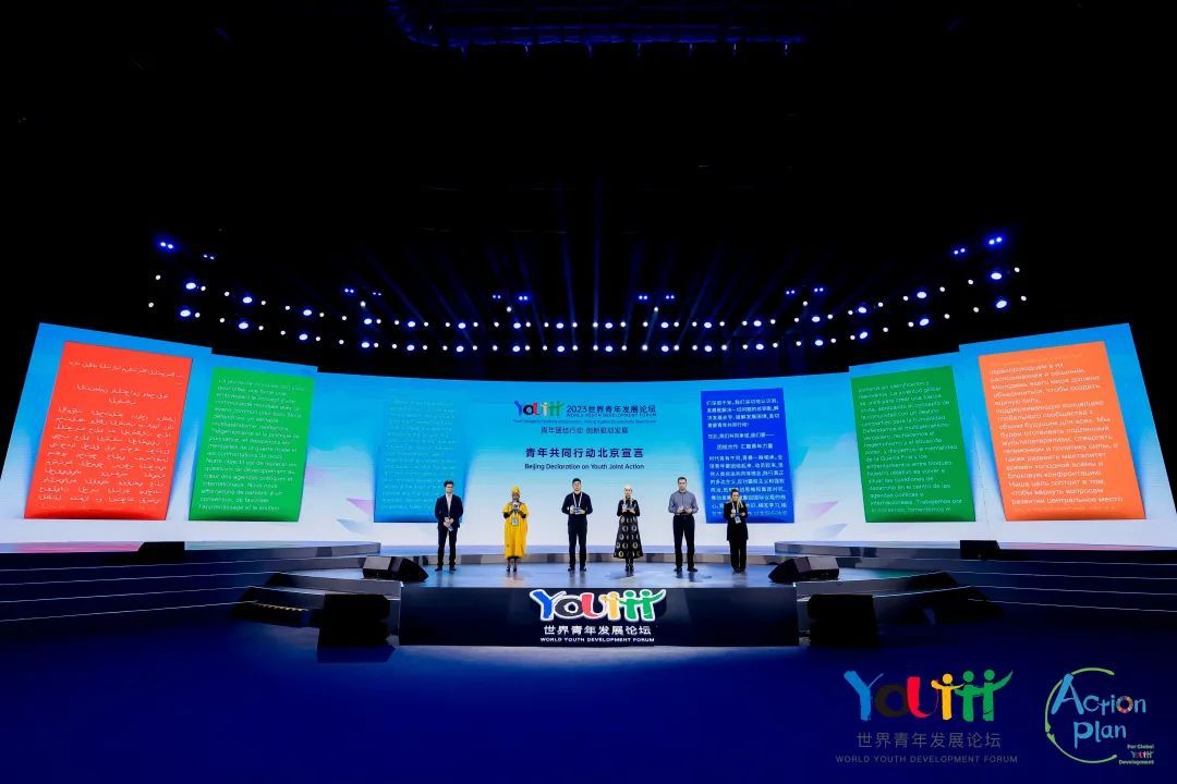 我们,来自五大洲130多个国家的青年领袖,于2023年10月30日至11月1日相聚北京,共襄2023年世界青年发展论坛这一盛举!论坛期间,参会代表聚焦“青年团结行动、创新驱动发展”主题,围绕青年数字发展、青年发展型城市、青年文化创新、应对气候与粮食危机等议题发表观点、交流经验、倡导行动。全球青年发展行动计划展示了100个全球青年发展典型项目。