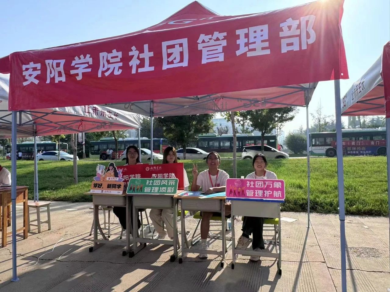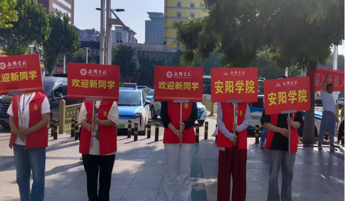 志愿者们手举迎新牌,身着统一服装