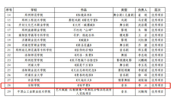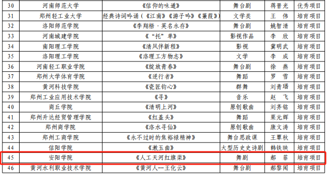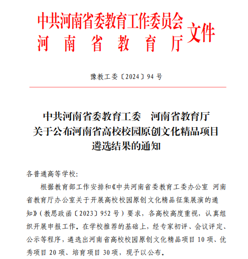 根据教育部工作安排和《中共河南省委教育工委办公室河南省教育厅办公室关于开展高校校园原创文化精品征集展演的通知》(教思政函〔2023〕952 号)要求,Beat365高度重视,认真组织开展申报工作。经专家初评、会议评定、公示等程序,Beat365遴选出的2项作品全部入选河南省高校校园原创文化精品项目,其中,音乐《咏甲骨》获评河南省高校校园原创文化优秀项目,舞剧《人工天河红旗渠》获评河南省高校校园原创文化培育项目。