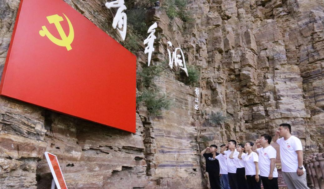 红旗渠实践队党员老师们在青年洞面对党旗重温入党誓词,感悟精神伟力,身为青年要有新作为、新担当,以不怕苦、不畏难、不惧牺牲的红旗渠精神,肩负起历史赋予的责任,铿锵有力的声音彰显了他们的自豪感与使命感。