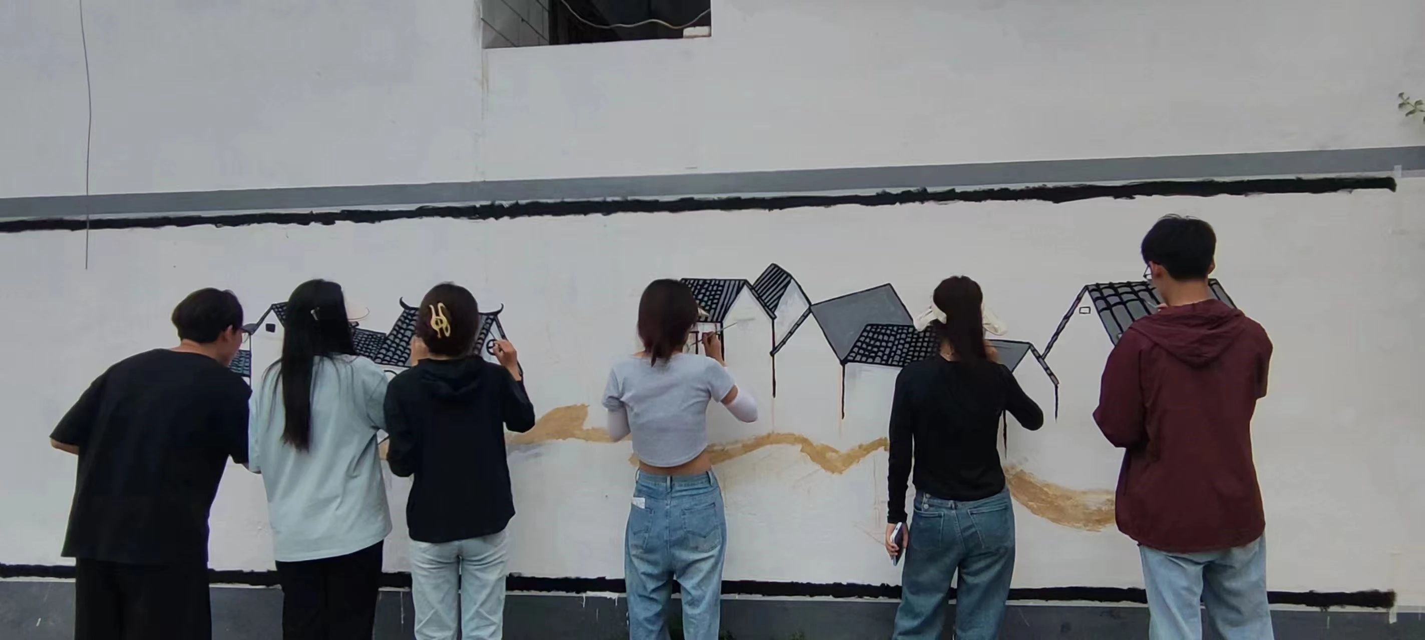 盛夏烈阳侵袭,一顶顶遮阳帽下是一张张通红的脸,一支支画笔下是一颗颗炽热的心,同学们在墙上全神贯注地用笔勾勒出精美图案。为了更好地将墙绘内容与当地特色融合,同学们在墙绘开始之前对当地风景进行针对性调研与文化挖掘,走访村民,深入田间,设计墙绘内容,将民族大义与高尚品德用美的方式生动形象地呈现出来,为村容村貌注入新的活力,进一步将当地别有韵味的特色呈现出来。