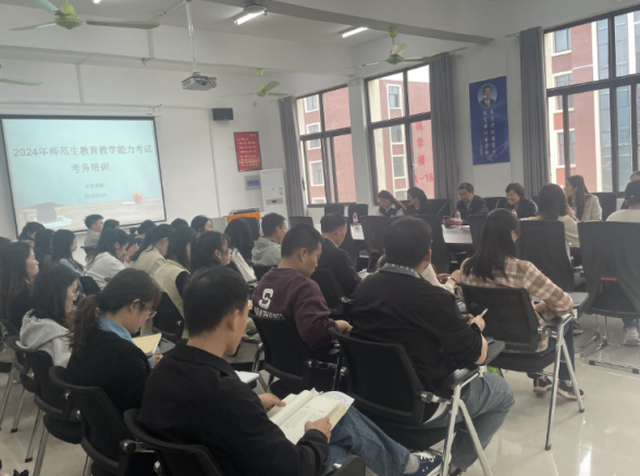 考试前,为了保证2024年师范生教育教学能力考试顺利进行,2024年4月19日下午2点30分,教育学院在17#402组织开展2024年师范生教育教学能力考试考务培训会,旨在明确监考要求,规范考试纪律。教育学院院长主持会议,王爱民副校长、陈韶副部长出席会议,教育学院全体考试工作人员参会。王爱民副校长指出,要高度重视师范生免试认定工作,提高站位,把本次考试当作政治任务,做到对学校负责,对学生负责,对每个人负责,确保本次工作零遗憾。教育学院院长对校长讲话进行深度剖析,提出工作要求:我管我负责,做好了才算做了。在进行免试认定相关工作时,务必要认真仔细,将每一个工作细节落实到位,保证工作质量。接着,郑利霞助理和郭晓玲秘书对考试的基本流程、考场纪律、监考职责等做了系统培训。