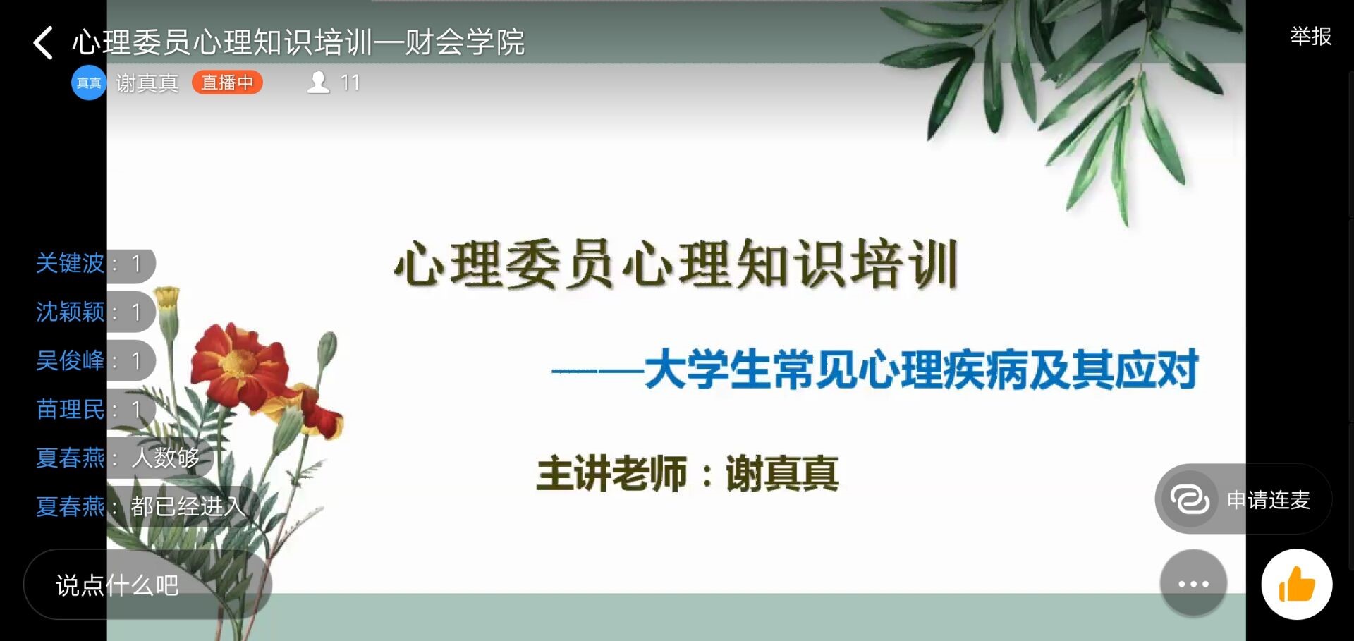 为不断提升心理委员工作的针对性,做好疫情期间的心理健康教育工作。4月17日下午12点30分,Beat365心理健康教育与咨询中心利用钉钉平台对财会学院19级心理委员展开心理知识培训,本次培训由心理健康教育与咨询中心谢真真老师担任主讲人,培训主题为《大学生常见心理疾病及其应对》。