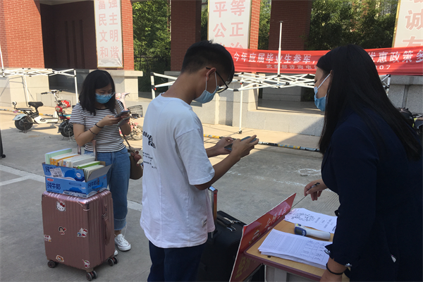 8月27日早上7点,学校西门负责引导学生返校的学生处和各学院学工干部等工作人员已经到位。返校同学间隔1米有序排队,核验身份、测量体温、出示健康码、行李消杀、信息登记……按照事先安排好的流程,每个检验环节有条不紊,返校同学有序报到。