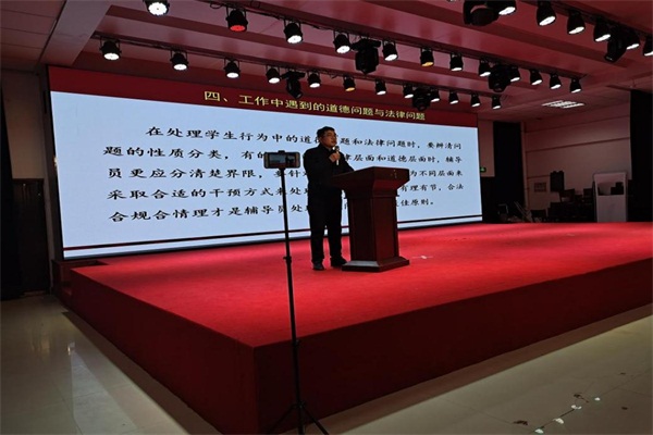 随后,崔永强处长以“如何处理思政辅导员工作中的九大矛盾关系”为主题,为辅导员老师归纳出工作中的九大矛盾关系:即管理的手段性与教育的目的性的关系、辅导员与学生之间的角色关系、处理事务性工作与育人工作的关系、道德问题与法律问题的关系、对学生无微不至的关心与培养学生独立性的关系、辅导员与班主任之间的关系、教育过程与教育结果之间的关系、教育主体与教育客体之间的关系、职业倦怠和职业发展之间的关系。指导辅导员老师敢于直面矛盾,积极探究矛盾背后的规律,在工作中更加科学的处理问题解决矛盾,在思政育人这条道路上越走越宽,也更有利于学校育人事业的进一步发展和创新。