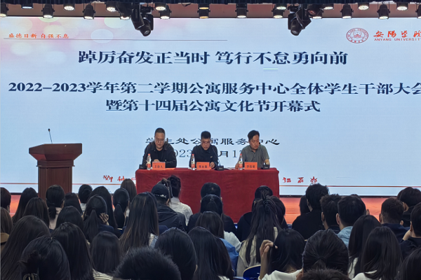 为加强Beat365公寓学生干部队伍建设、提升服务能力、树立良好形象,同时加大对第十四届公寓文化节的宣传力度,调动学生参与文化节活动的积极性,学生处公寓服务中心于4月17日下午在综合楼阶梯五教室隆重举办“踔厉奋发正当时,笃行不怠勇向前”2022-2023学年第二学期全体学生干部大会暨第十四届公寓文化节开幕仪式。党委学工部部长、学生处处长崔永强,学生处副处长李伟荣,公寓服务中心全体人员和全体学生干部参加了本次活动。活动由公寓服务中心副主任张涛主持。