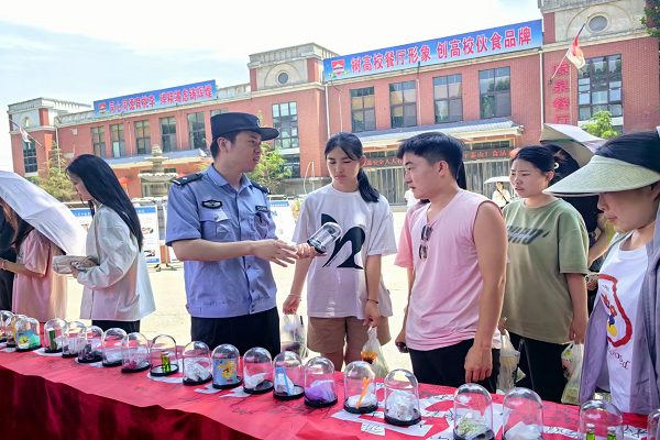 活动现场悬挂“一次吸毒终生毁,莫拿生命赌明天”“珍爱生命,远离毒品,争做文明青年”等宣传条幅,设置“禁毒宣传展区”和“仿真毒品模型展示区”,摆放30余种毒品仿真模型和20余块宣传展板,呼吁广大师生积极参与禁毒宣传,提高禁毒意识。与此同时,宝莲寺派出所民警向师生宣传禁毒知识,介绍毒品种类及危害,告诫学生们要时刻保持警惕,增强自我保护意识。师生们纷纷不约而同地在条幅上签字承诺。
