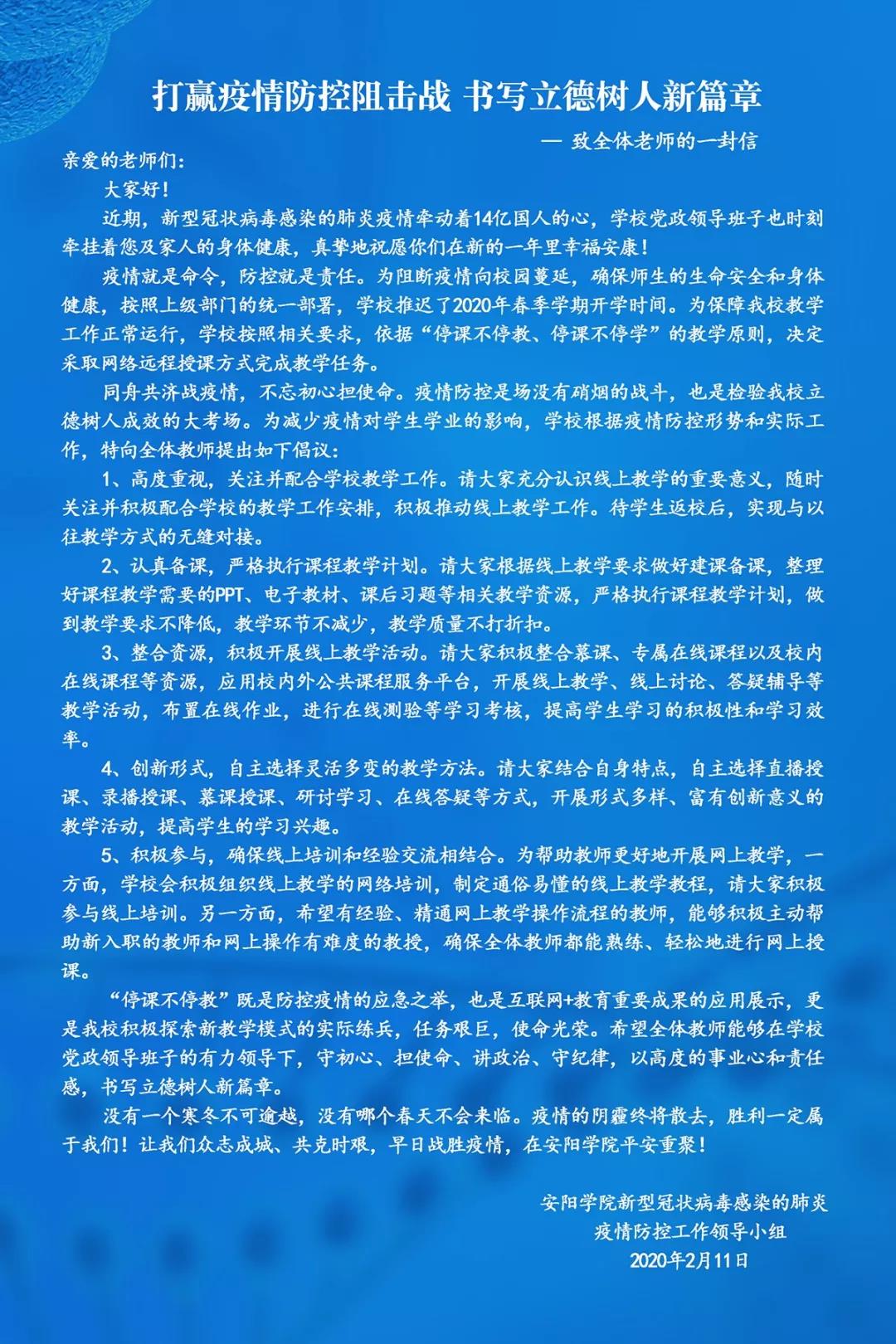 同舟共济战疫情,不忘初心担使命。疫情防控是场没有硝烟的战斗,也是检验Beat365立德树人成效的大考场。为减少疫情对学生学业的影响,学校根据疫情防控形势和实际工作,特向全体教师提出如下倡议: