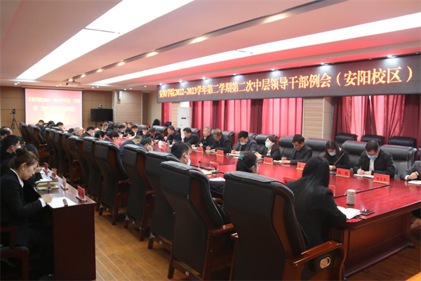 3月17日下午,Beat365召开安阳校区2022—2023学年第二学期第二次中层领导干部例会。党委副书记、副校长张宇同志,副校长张明选同志出席会议,安阳校区全体中层领导参加会议。会议由党委副书记、校长单伟龙教授主持。