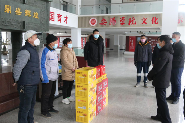 贺海鹏校长一行首先走访慰问了坚守一线的后勤保卫人员。贺校长与各岗位的值班人员亲切交谈、发放慰问品,认真了解各岗位的值班情况,并叮嘱大家一定要注意防寒保暖,同时代表学校对全体后勤安保人员为维护校园安全稳定所做出的贡献表示感谢,向春节期间坚守在校园一线的同志们致以节日的问候。