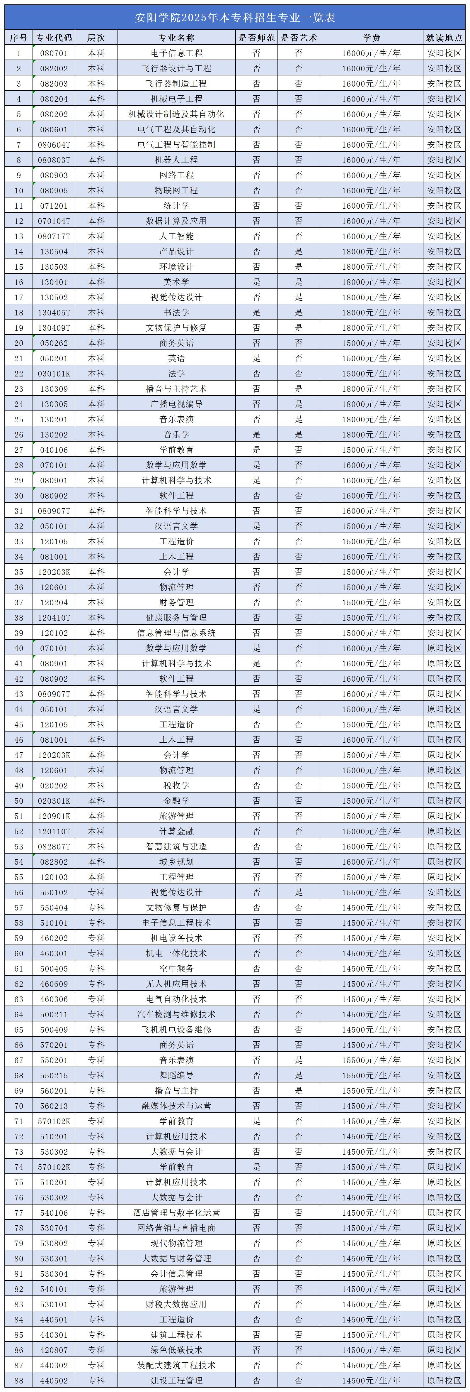 1.安阳校区本科招生专业有电子信息工程、飞行器设计与工程、飞行器制造工程、机械电子工程、机械设计制造及其自动化、电气工程及其自动化、电气工程与智能控制、机器人工程、网络工程、物联网工程、统计学、数据计算及应用、人工智能、产品设计、环境设计、美术学、视觉传达设计、书法学、文物保护与修复、商务英语、法学、播音与主持艺术、广播电视编导、音乐表演、音乐学、数学与应用数学、计算机科学与技术、软件工程、智能科学与技术、英语、学前教育、汉语言文学、工程造价、土木工程、会计学、物流管理、财务管理、健康服务与管理、信息管理与信息系统。