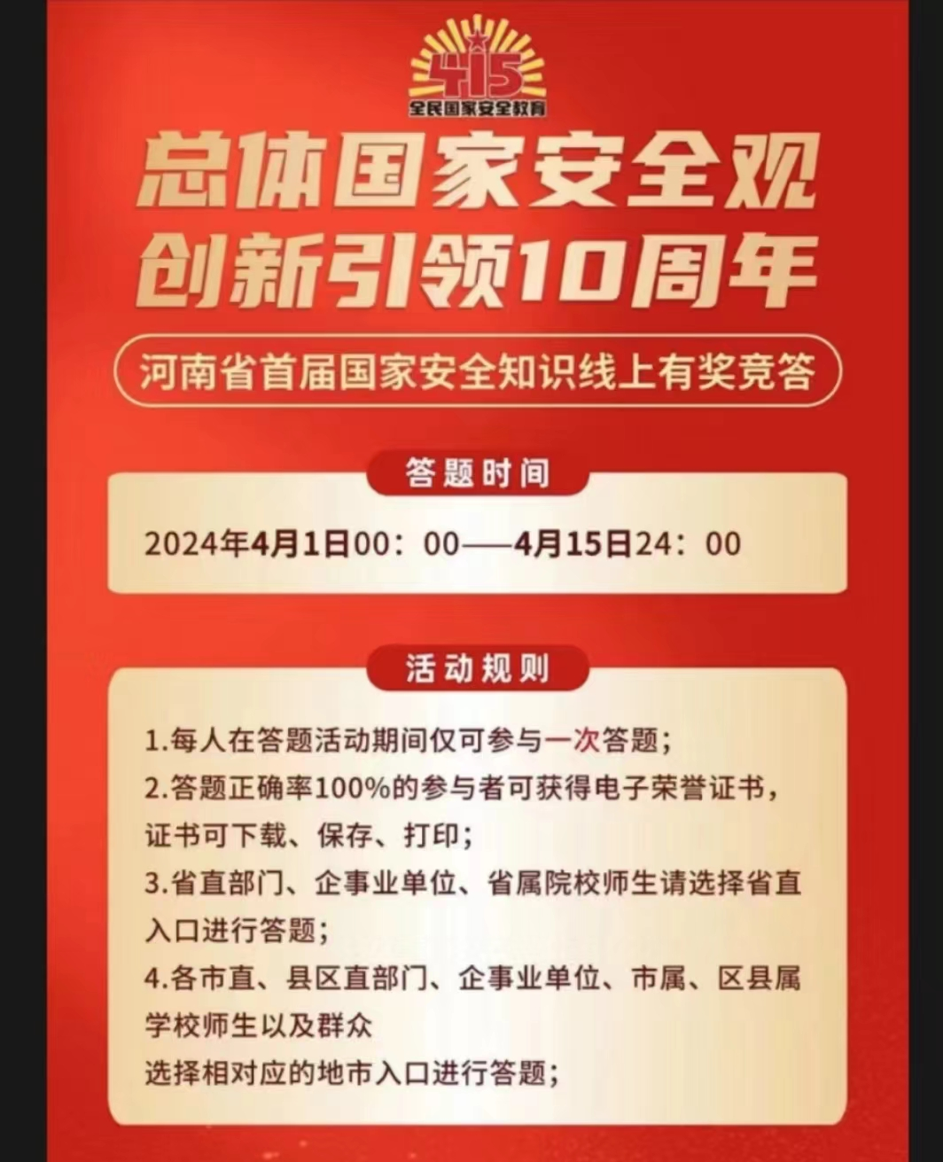 为培养同学们正确的国家安全观念和防范意识,增强国家认同感,全面普及国家安全意识、风险意识、反间谍意识、保密意识和政治警觉, 职业教育学院辅导员窦万余老师号召大专计算机2302班全体学生于4月11日参与以“总体国家安全观·创新引领10周年”为主题的有奖答题活动。