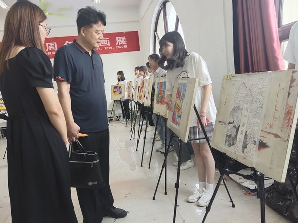 活动开始,思政辅导员史柠檬诚邀老师们前来观展,老师们纷纷到现场观看画展。他们依次观赏了展览的62幅作品,同学们热情的为老师们讲解画的涵义及细节。整个画展营造着欣欣向荣的氛围。